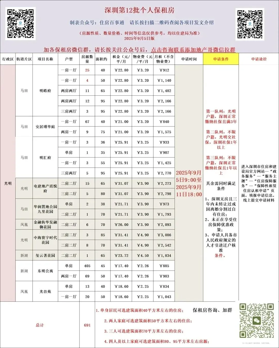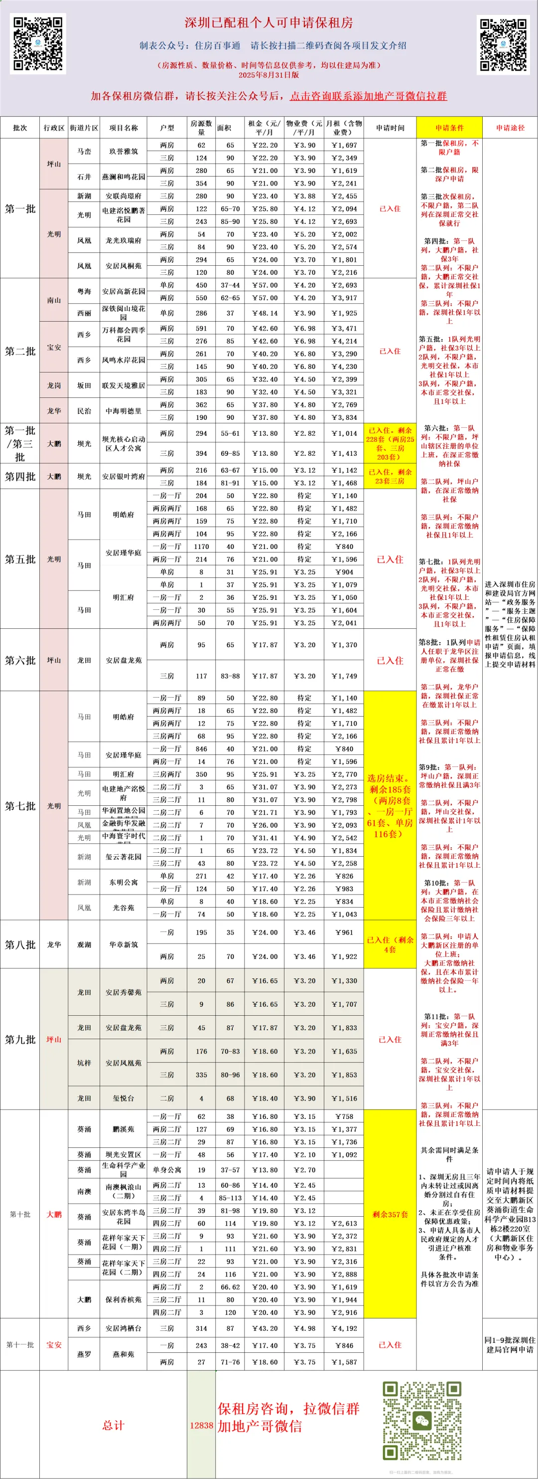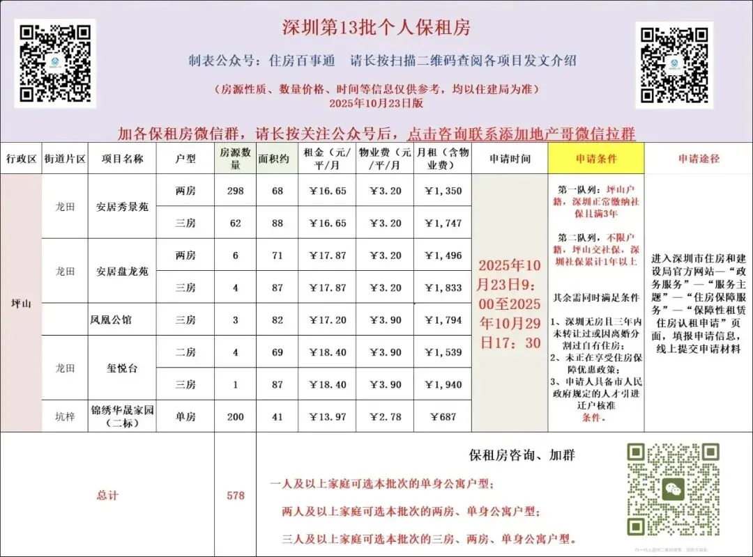坝光核心启动区人才公寓项目,共计309套房源,其中,68套为建筑面积55-61㎡的两房,100套为建筑面积69-73㎡的小三房,141套为建筑面积85㎡以上的三房。申请条件非常宽松:第一队列,深圳社保正常缴纳且累计1年以上;第二队列深圳社保正常缴纳就行。申请面积标准:1人两房,2人三房,3人85平大三房2人家庭可申请55-61㎡的两房户型住房或69-73㎡的小三房户型3人及以上家庭可申请55-61㎡的两房户型、69-73㎡的小三房户型、或85㎡以上的三房户型。龙岗区最新一批次,共计360套,位于永湖地铁站旁的绿海山河逸居项目,面向符合条件的龙岗工作的个人家庭配租。深圳第17批保租房,龙岗绿海山河逸居保租房,摇号结果出炉,总计360套房源,吸引了1965户家庭认租。这批次房源申请条件很高,第一队列要博士,第二队列要硕士,第三队列要本科;社保全部要求龙岗区社保,另外一个重要条件龙岗辖区企业工作且必须毕业3年内。租期不超过2年。摇号结果查询:https://www.lg.gov.cn/bmzz/zjj/zfbz/rcaj/content/post_12616024.html绿海山河逸居项目(以下简称“项目”)位于园山街道龙岗大道1026号,共360套住房,均为简装并配置部分家私家电(见附件1),其中建筑面积约40平方米的单身公寓144套,建筑面积约70平方米的两房216套,预计交付时间为2026年4月。租金标准:25.80元/平方米/月、物业服务费3.9元/平方米/月、物业专项维修资金0.25元/平方米/月。三、第16批大鹏区级保租房,1月27日选房!根本选不完本批次共计505套房源,最终参与选房家庭106户,远低于房源数量。400多套保租房会被“剩下”。其中40户选98套一房,第一队列 13户,第二队列27户。25户选208套两房,第一队列19户,第二队列6户。37户选107套三房,第一队列31户,第二队列6户。https://www.dpxq.gov.cn/zxfw/zdlyfw/bzxzf/tzgg/content/post_12616220.html本批次配租鹏溪苑、生命科学产业园、坝光安置区、陶柏莉花园二期、安居东湾半岛花园、花样年家天下花园(一期)、花样年家天下花园(二期)、招商东岸城央公寓、招商东岸家园、下沙安置区、保利香槟苑、南澳枫浪山花园(一期)、南澳枫浪山花园(二期)等13个项目,共计505套房源。这批次2人可申请92平的2房,3人114平的3房,4人120平4房,这简直就是高层次人才才有的面积标准,可惜大鹏人民需求内那么高。1-4房都将人人有份,去化率将非常低。又会剩余很多房源,再次说明大鹏区域内的生活工作的居民保租房需求真得不高,希望下次能开放给第三队列(深圳正常缴纳社保家庭)申请。龙岗京基御景荟都280套房源,已完成摇号,目前正在合格名单公示中,待公示选房。222套单身公寓及一房户型,认租合格家庭2056户,第一队列759户、第二队列912户、第三队列385户58套两房户型,认租合格家庭1176户,第一队列590户、第二队列332户、第三队列254户光明区安居嘉禧苑,虹霓轩项目,共计1274套面向个人家庭配租,已完成摇号待公示选房,共计9901户家庭认租。深圳保租房最低申请条件:不限户籍,深圳社保1年以上+满足人才迁户标准即可。2025年除福田、南山、罗湖、盐田4个区没有面向个人家庭配租保租房,其余龙岗、光明、宝安、龙华、大鹏、坪山均有个人房源配租。其中前面13个批次14107套已完成选房,剩余1019套没有选完。关注地产哥深圳安居房人才房公众号,不错过深圳保租房配租信息。有需要的家庭可以加地产哥专属付费会员,一对一保障。需要咨询保租房的家庭,可以添加地产哥微信,加入地产哥保租房付费会员,享受专属会员服务。获取深圳保租房待配租房源明细,一对一指导申请保租房、一对一解答,根据你的需求提供专业定制化服务,不会错过保租房消息。第3批大鹏房源剩余228套(两房25套、三房203套)。第7批光明项目剩余185(两房8套,单房177套),这些剩余房源,第12批已经再次拿出来配租了。第13批坪山项目剩余173套(两房18套,单房155套)深圳各区待配租的6折保租房, 地产哥为大家梳理了部分房源信息。仅供参考(实际配租项目、面向的配租对象等以住建局官网为准)。深圳各区待配租的6折保租房,地产哥已发文介绍的28个项目:大家可以点击蓝色字体往期发文链接查看。宝安区:万科未来之光、松溪家园、越秀瑞樾府、雍境名邸