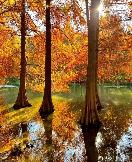 关键是这个地方的落羽杉长得特别漂亮,不是零零散散几棵点缀在那,是成片成片的林子,树干笔直地扎进水里,树冠在头顶铺开来,阳光从叶子缝里漏下来的时候,整个人就站在一片金红色的光影里,这个画面你在植物园很难遇到,因为植物园的落羽杉大多种在岸边,隔着栏杆你只能远远看着,但这里不一样,这里的落羽杉就长在浅水区,你能走到树底下,能看清楚每一片叶子的颜色变化,能感受到那种被秋天包围的真实感。