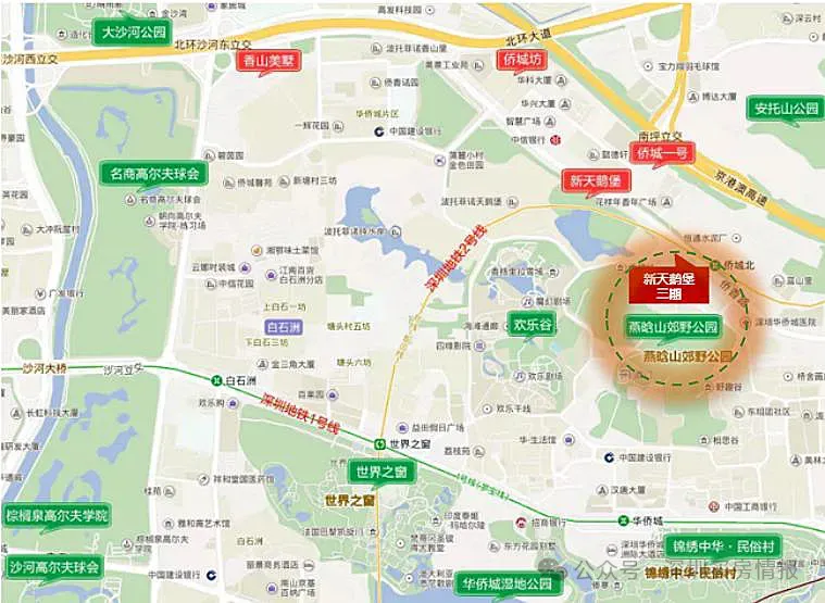 新天鹅堡三期处于华侨城片区侨香路与香山东街的交汇处,楼下就是2号线侨城北站地铁口,从区位上来说,华侨城片区作为深圳传统的豪宅片区,地处深圳中心地段,与南山科技园、超级总部基地、福田香蜜湖等核心片区相邻。