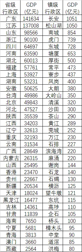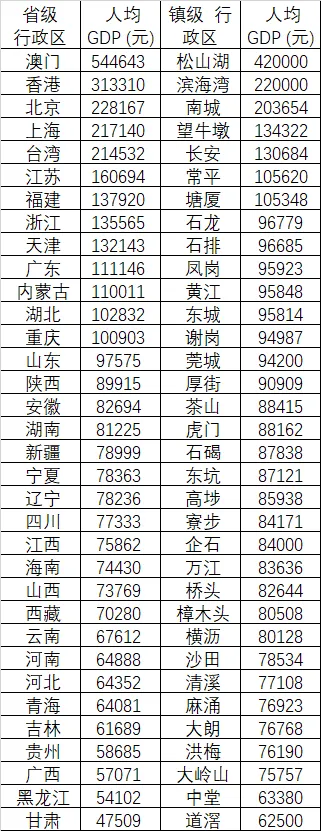 在上表的底部,中堂和道滘分别对应着黑龙江和甘肃,但省级行政区人均GDP更低。