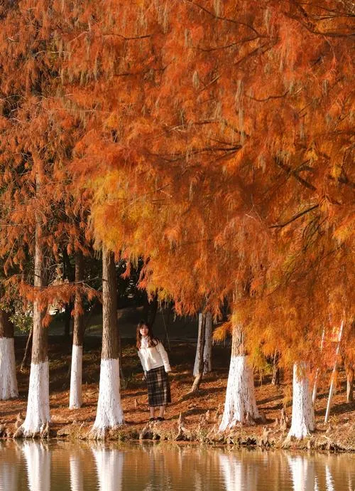 小贴士:去之前记得查查天气,最好选个晴天,阳光好的时候落羽杉的颜色才能真正透出来,阴天拍出来会发灰,拍照的时候避开中午那会儿光线太硬,早上十点前或者下午三点后去最合适,光线柔和又不晒,穿衣服的话浅色系会更出片,米色、白色、浅灰都行,跟落羽杉的焦糖色正好搭,如果想拍倒影记得找有水的地方,拍之前先观察一下哪个角度树最密,这样拍出来层次感才足。