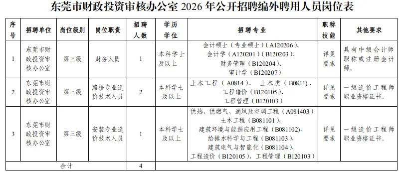东莞市财政投资审核办公室合计招聘普通聘员4人。