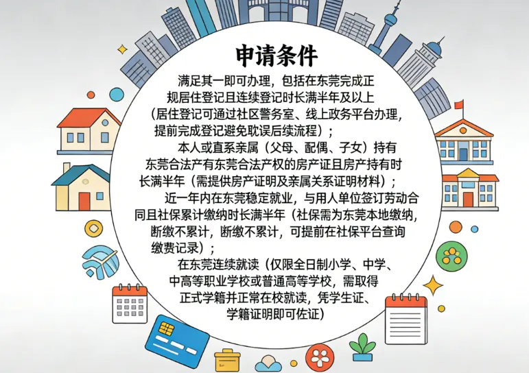 - 在东莞完成正规居住登记,且连续登记时长满半年及以上(居住登记可通过社区警务室、线上政务平台办理,提前完成登记避免耽误后续流程);