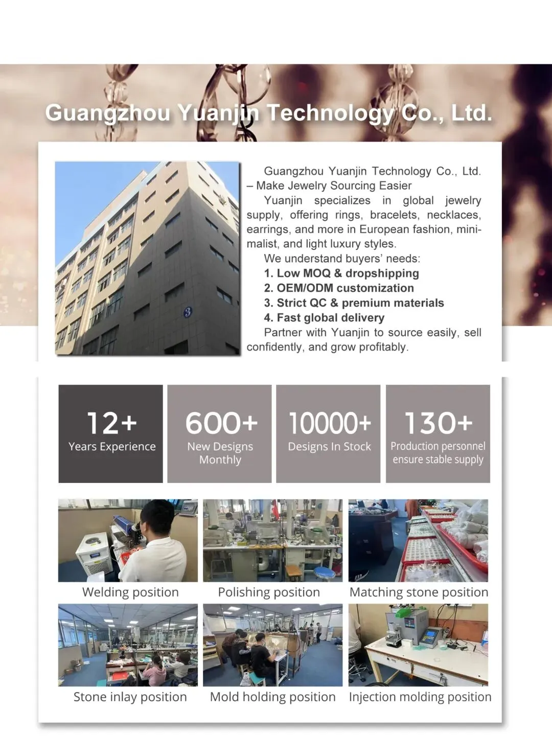 广州原锦科技有限公司是一家由年轻创业团队创立的跨境电商企业,专注于珠宝饰品出海业务。公司秉持“品质连接世界”的理念,依托中国成熟稳定的饰品供应链与国际化运营能力,将兼具设计美感与文化故事的产品输送至全球市场。团队具备跨境电商与数字化运营实战经验,善于融合AI工具与数据驱动决策,持续提升选品、运营与交付效率,致力于为全球客户提供高效、可靠、可持续的跨境贸易解决方案。