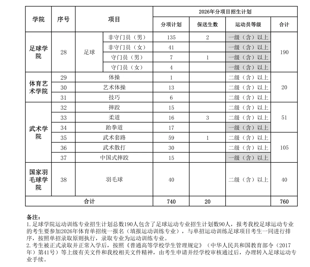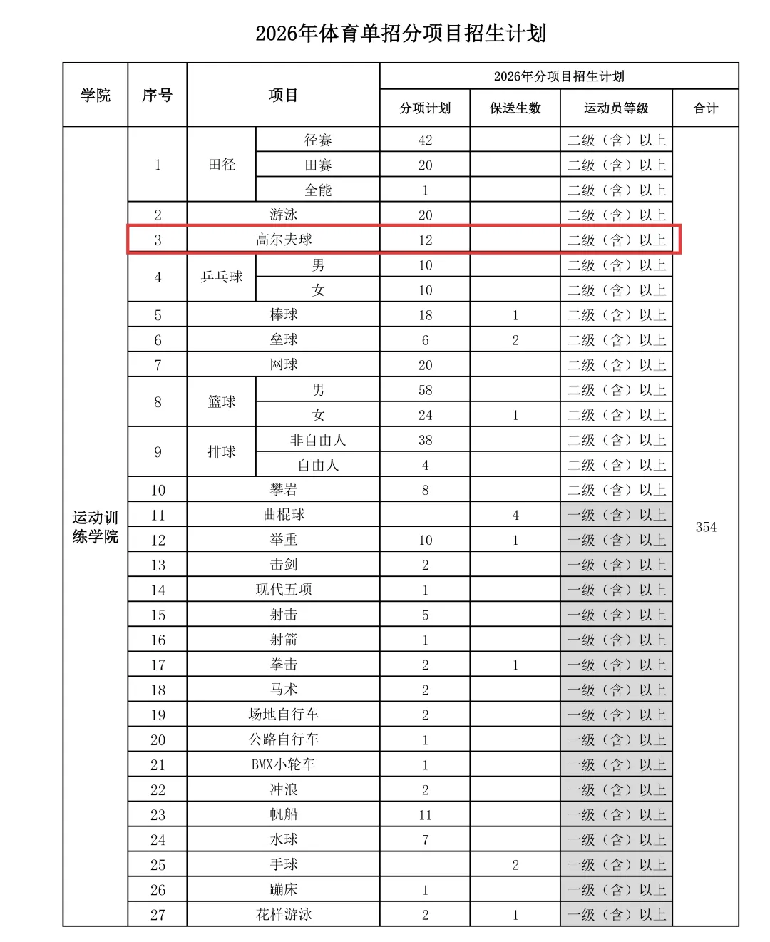 (1)招收国家二级含以上运动员的项目:田径(分田赛、径赛和全能)、篮球(分男女)、排球(分非自由人、自由人)、乒乓球(分男女)、羽毛球、网球、游泳、体操、艺术体操、技巧、摔跤(自由式、古典式)、棒球、垒球、柔道、高尔夫球、攀岩。