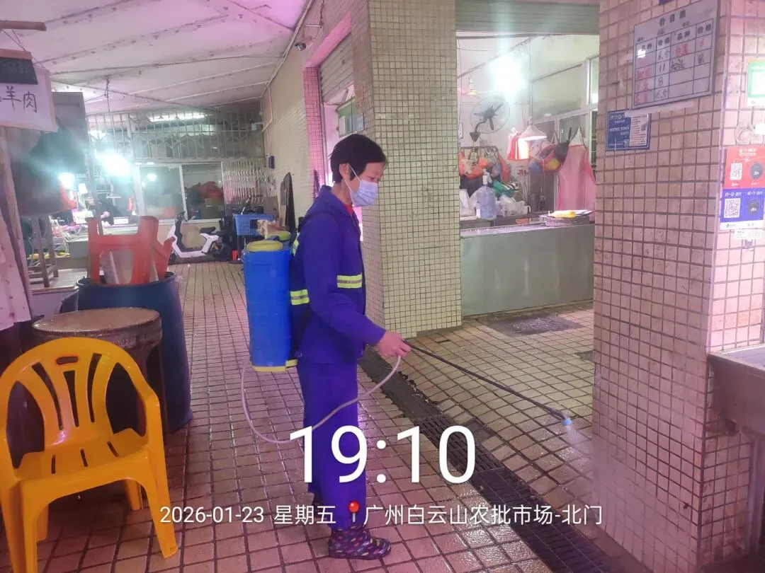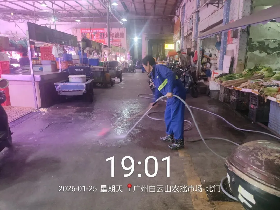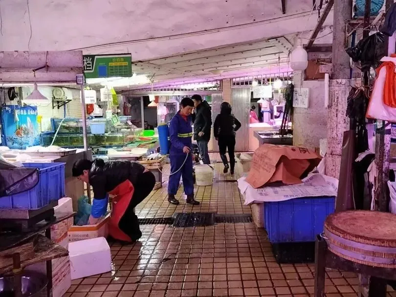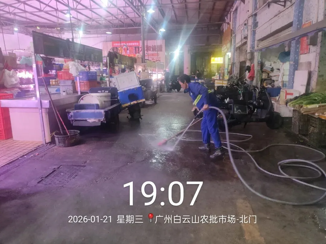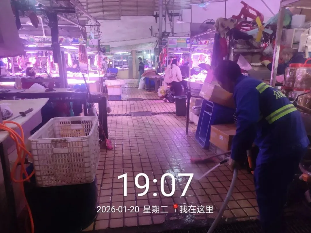 2、一周以来,市场保洁人员每晚落实肉菜小市场收市后的清洗与消毒工作,保持经营环境干净、整洁。