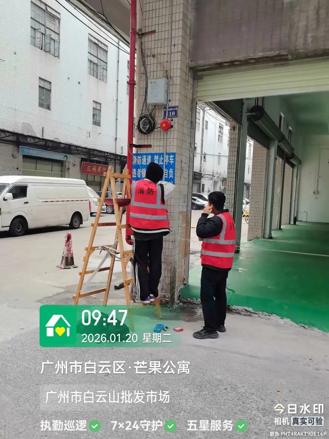 1、1月20日上午,第三方消防维保公司工作人员到市场巡查并维修消防设施,确保其正常运行。市场管理部工作人员陪同。