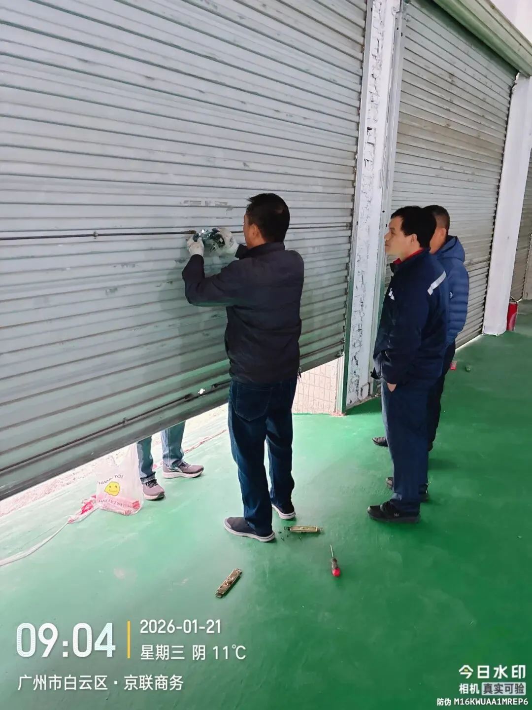 2、1月21日上午,市场管理部工作人员为沙太北路100号109-113铺更换卷闸门锁,以保障其正常使用。