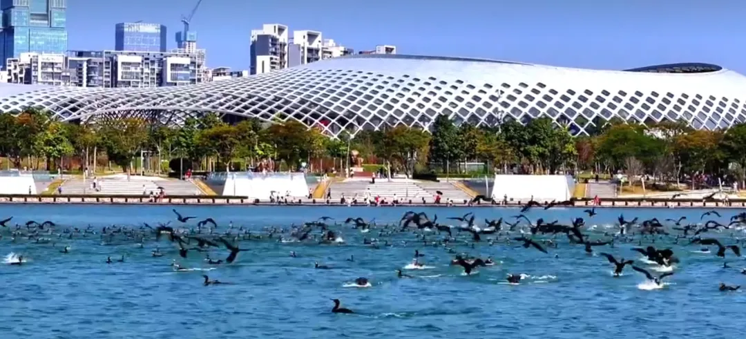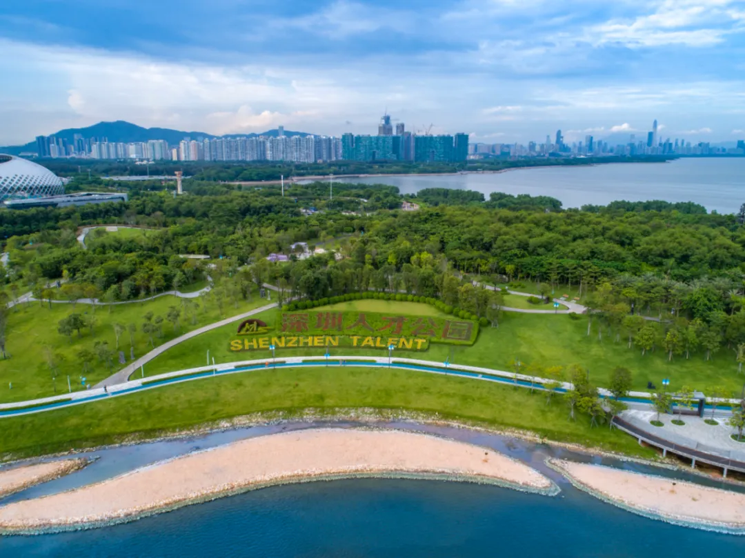 在人才公园,可面朝大海徜徉湾区美景,也可驻足园区沉浸鸟语花香。公园的水域面积宽阔,和花草树木以及远处的深圳湾建筑群交相辉映,宛如一幅美丽的生态画卷。”