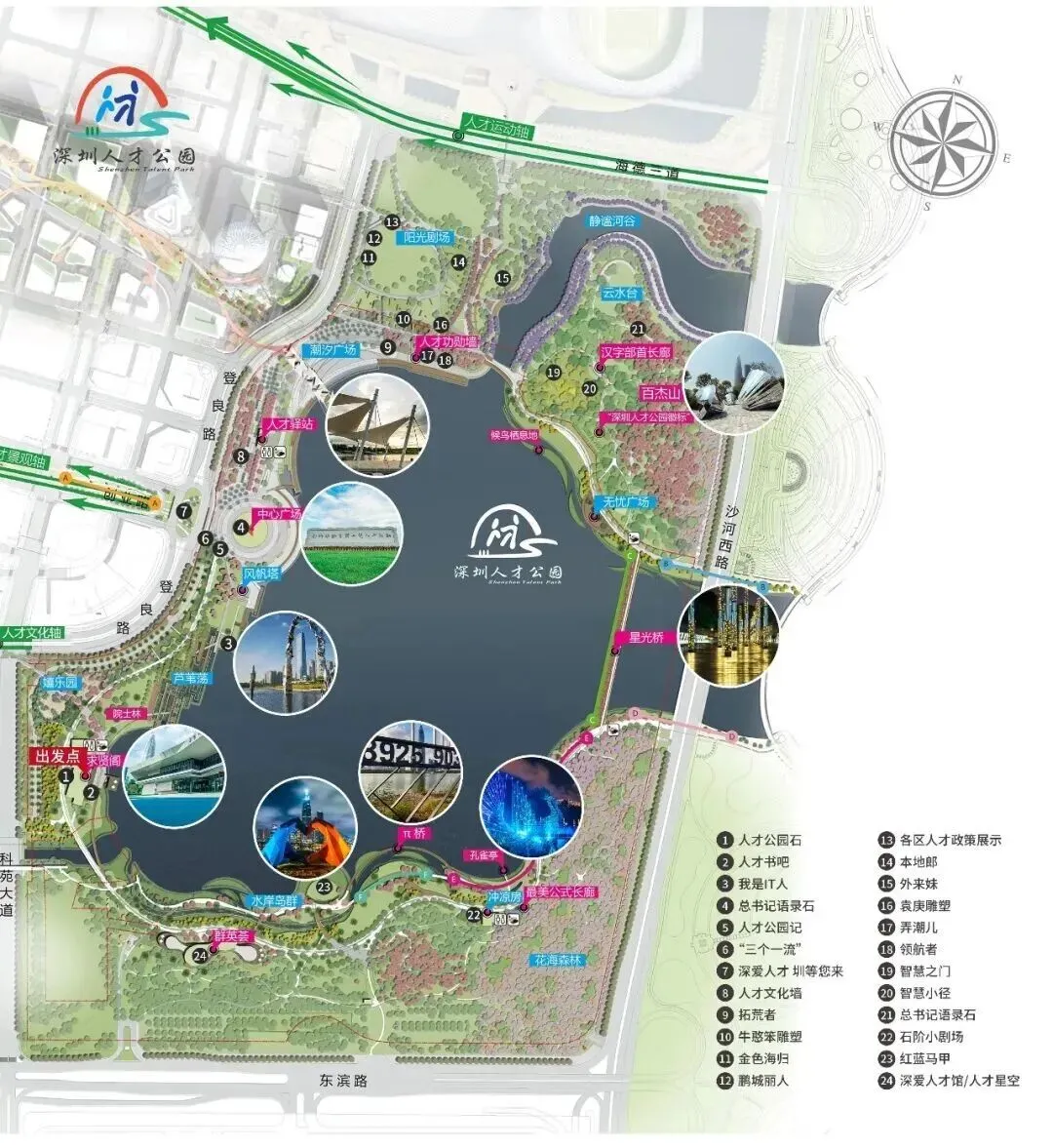 “深爱人才,圳等您来”在人才公园漫步,既可感受海风轻拂仪花共舞的惬意,也能在黄昏时看星光桥的灯光与城市天际线交相辉映。这里不仅是自然美景的展示窗口,更是深圳尊贤爱才城市精神的生动体现,邀请每一位来访者在此感受城市的温度与自然的诗意。还想了解更多关于深圳公园的信息?带上《公园深圳》,探索山海连城,遇见绿美深圳,一起来解锁深圳公园更多惊喜吧!