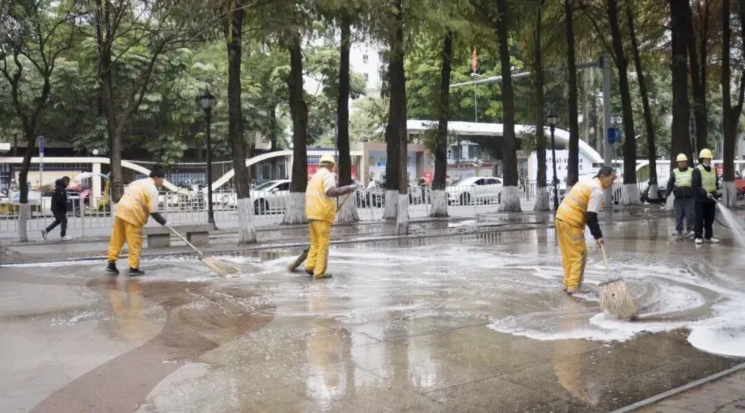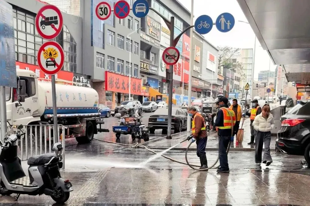 其中,寮步全镇出动了94支专业消杀队,使用常量滞留喷洒、热烟雾喷洒等设备,对农贸市场、公共厕所、背街冷巷等蚊虫易聚集区域进行全覆盖作业,当日使用药剂580余升,覆盖面积达16平方公里,以科技力量筑牢公共卫生防线。同时,针对路面油污和“城市家具”,采用“冲+扫+擦”组合拳,高压冲洗道路230余条,精细化清洗各类设施515件,展现了作业的精度与广度。