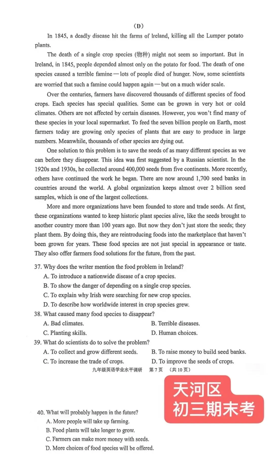 爱尔兰土豆大饥荒(Potato Famine)与种子银行(Seed Bank)。这是一篇典型的科普说明文。走的是“提出问题——分析问题——解决问题”的学术路线。