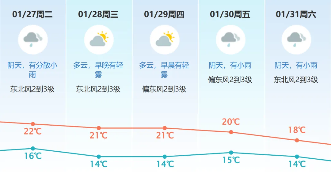 30日阴天,有小雨;31日—2月2日受新一股冷空气影响,气温下降,有小雨。