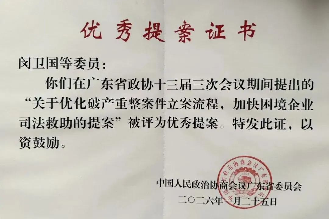 省政协常委闵卫国律师领衔提交的《关于优化破产重整案件立案流程,加快困境企业司法救助的提案》,获得国家金融监督管理总局广东监管局、广东省高级人民法院等单位的高度重视并给予答复,省高院表示将指导全省法院积极推动简化破产重整案件立案流程,国家金融监督管理总局广东监管局表示将持续加强与省市两级法院的沟通合作,配合做好政策推广落地工作不断提升银行业金融机构办理破产企业涉金融业务效率,进一步推动优化营商环境。