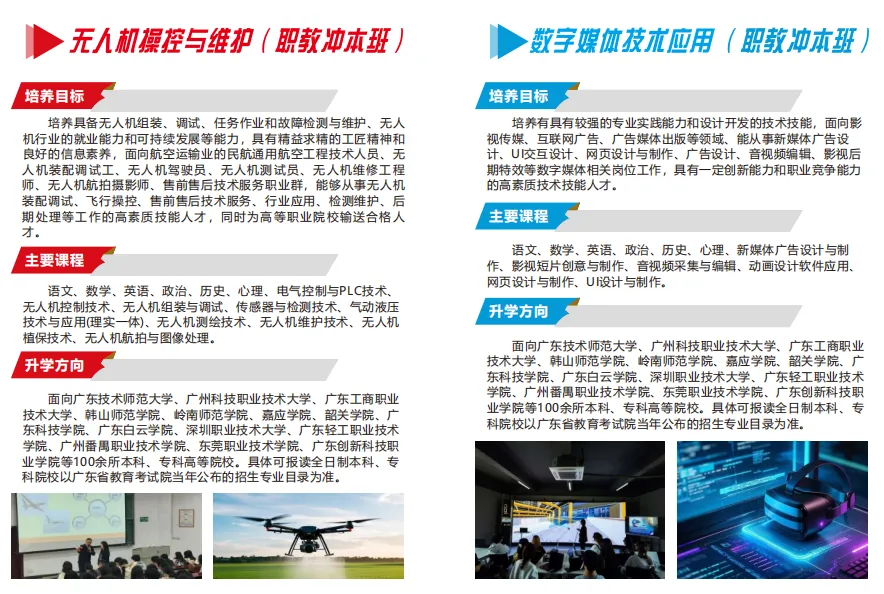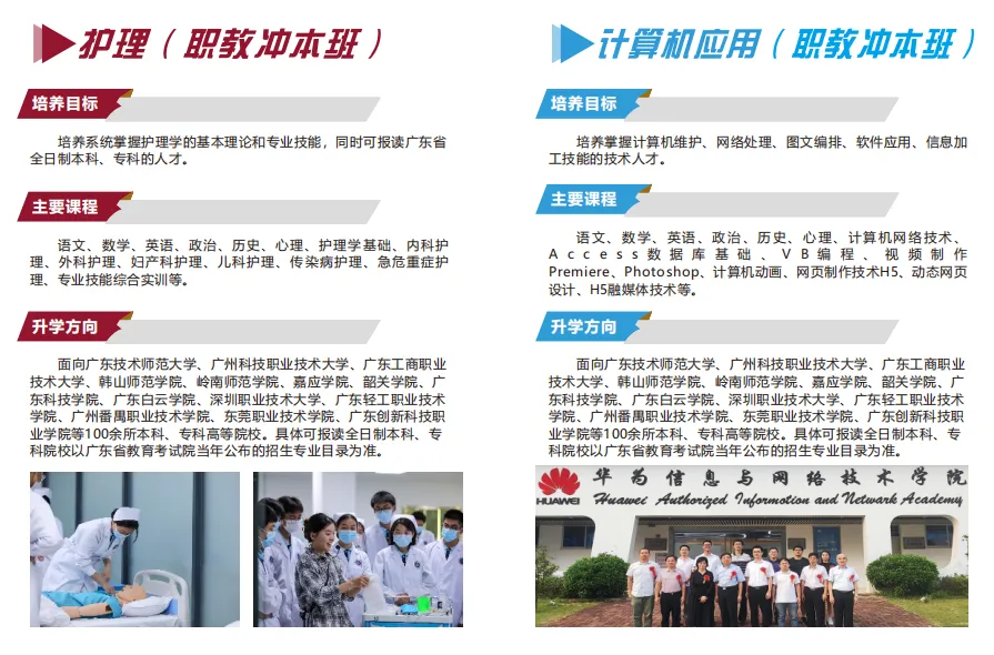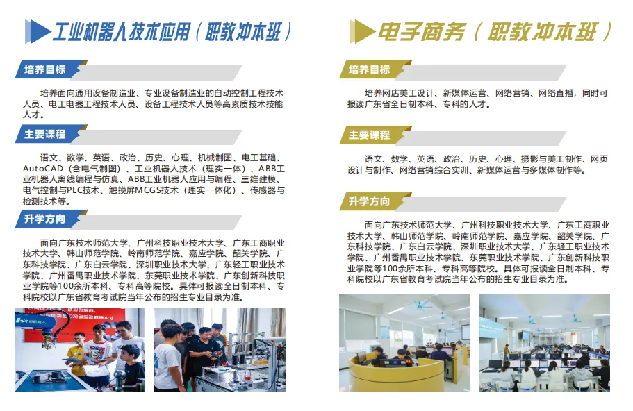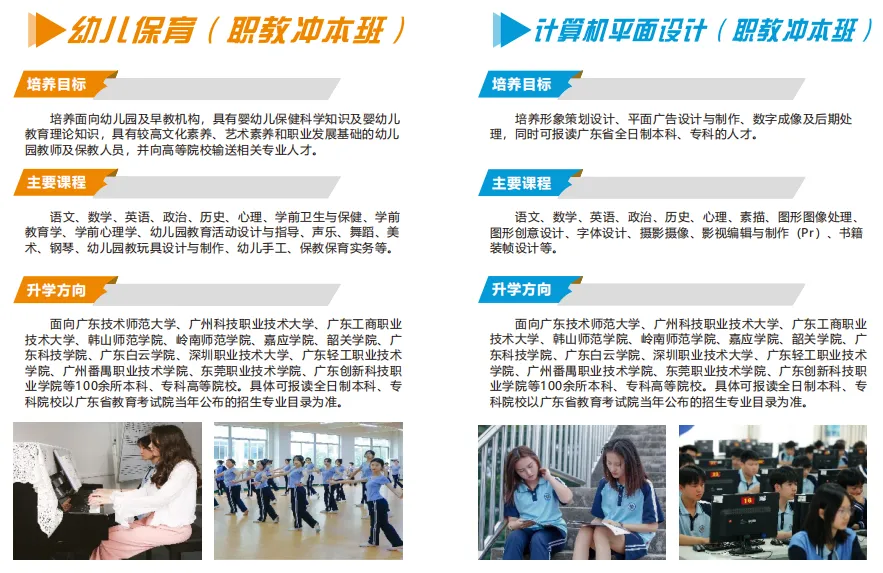 中职部作为广东创新科技职业学院战略发展的重要组成部分,其依托学校优质的教育教学资源,先进的实验实训场地,丰富的校园活动场所,力求打造一个”高起点、高质量、高发展“的中等职业教育平台,与此同时,中职部学生更可通过”3+证书“高考、三二分段“等升学模式在校内与大专院校无缝对接,取得国家承认的大专学历。