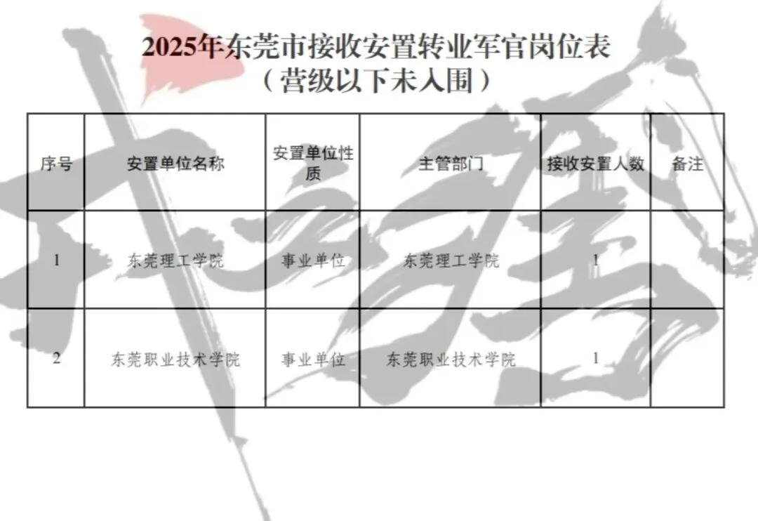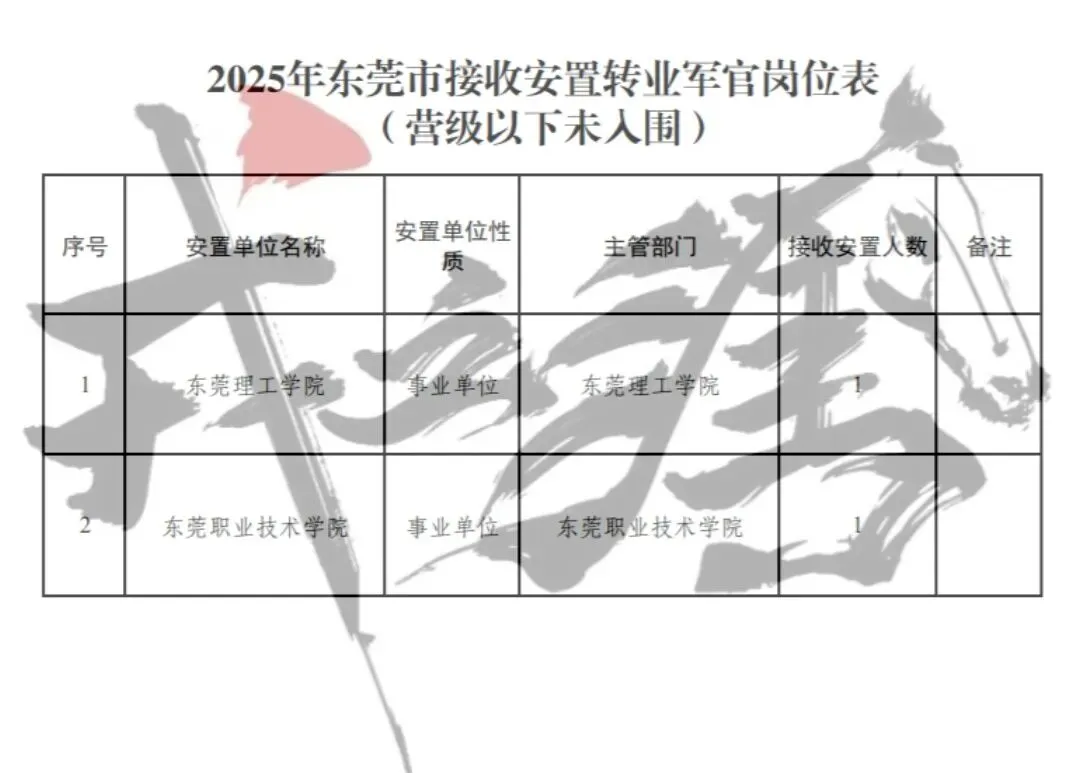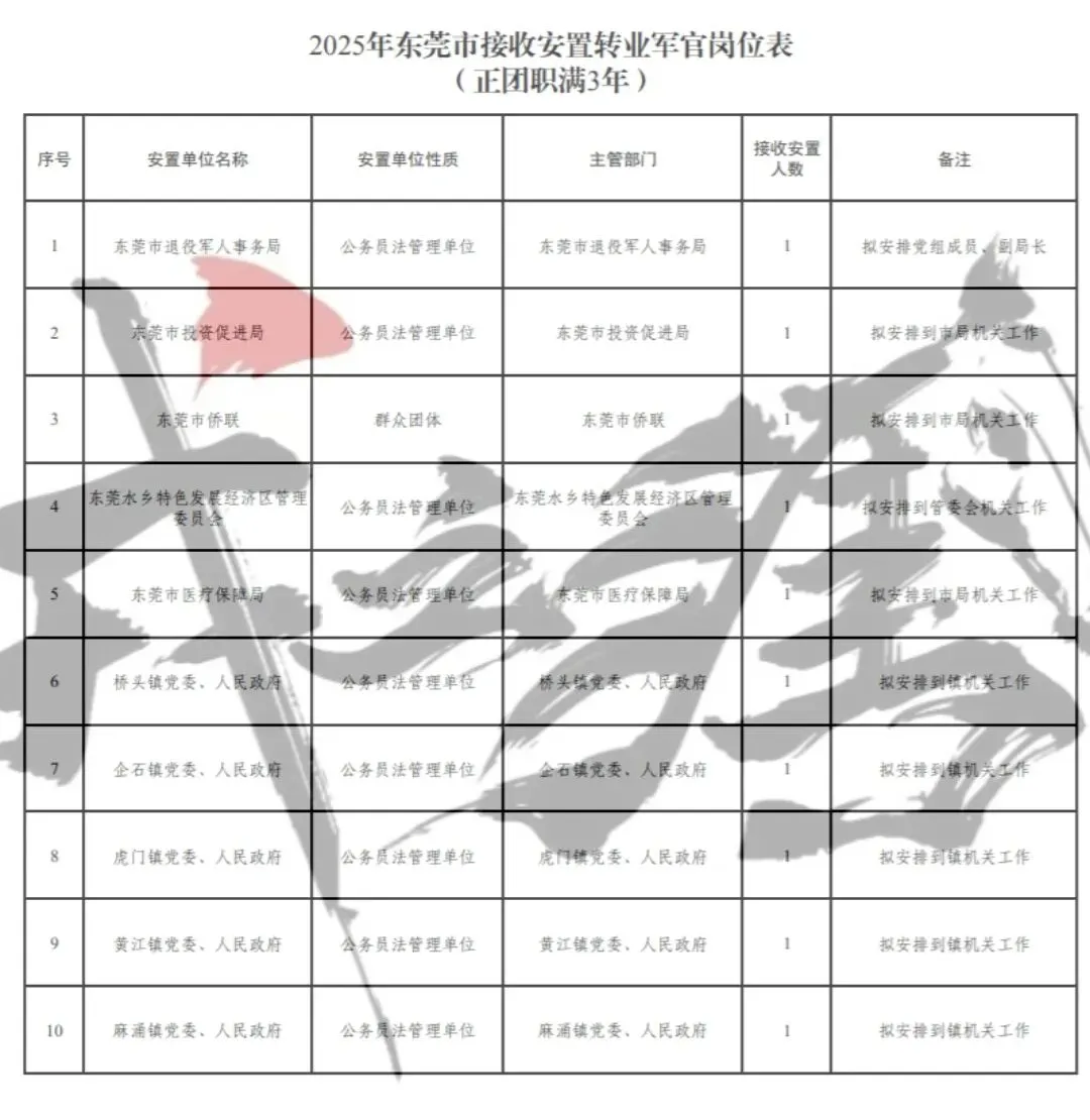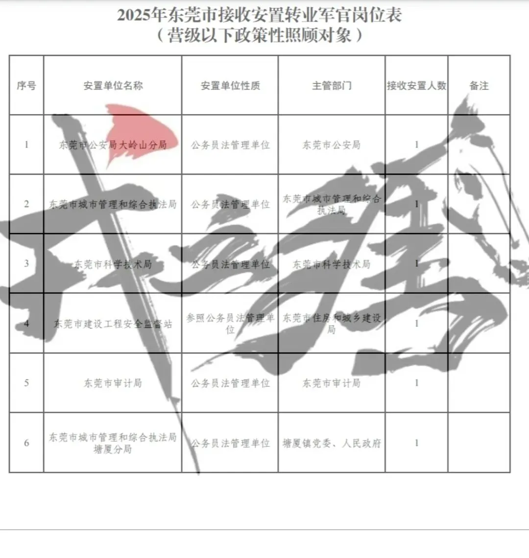 【广东省东莞市】2025年军队转业军官安置岗位公示