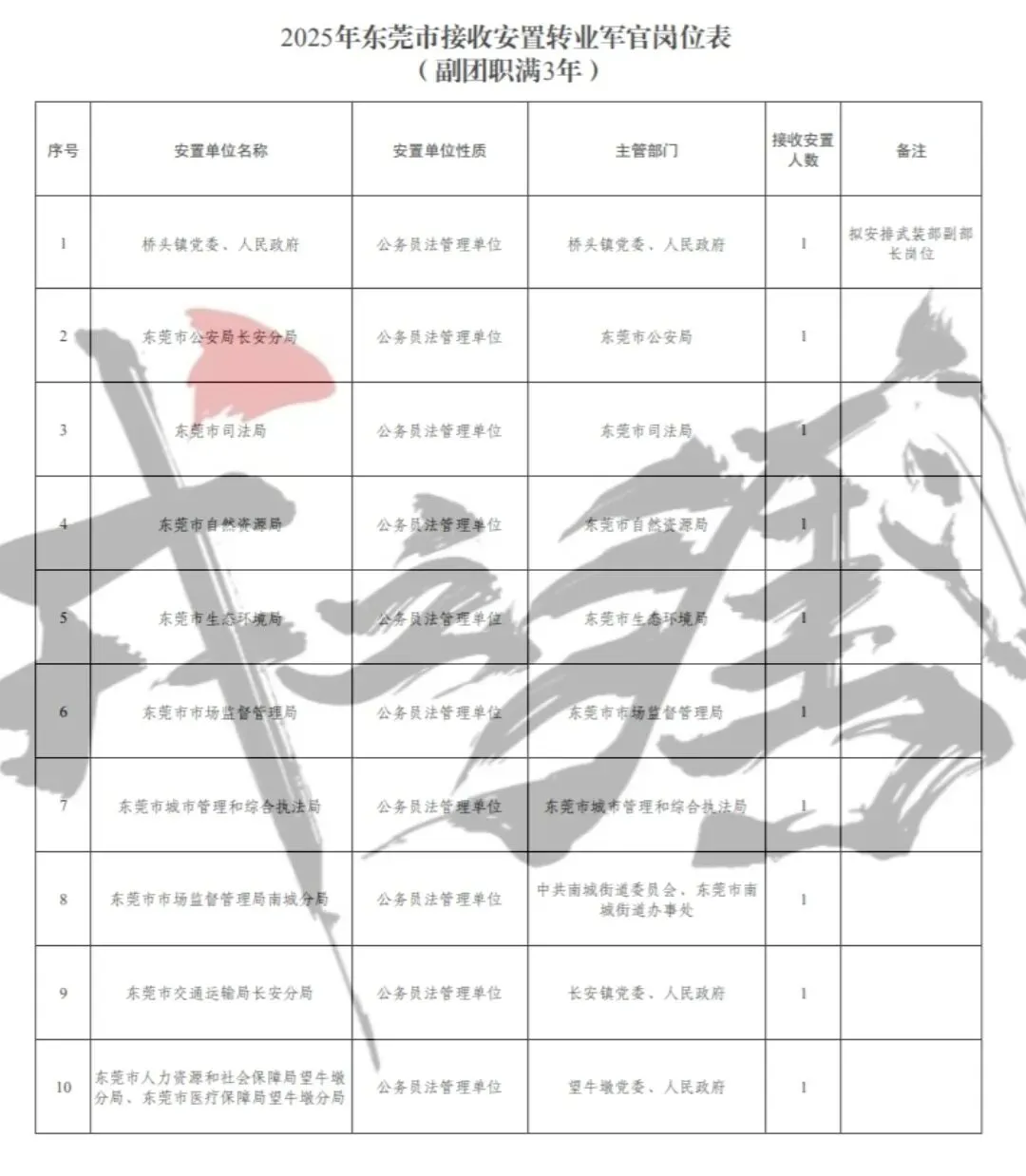 >【广东省东莞市】2025年军队转业军官安置岗位公示