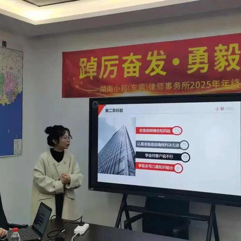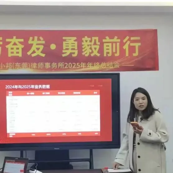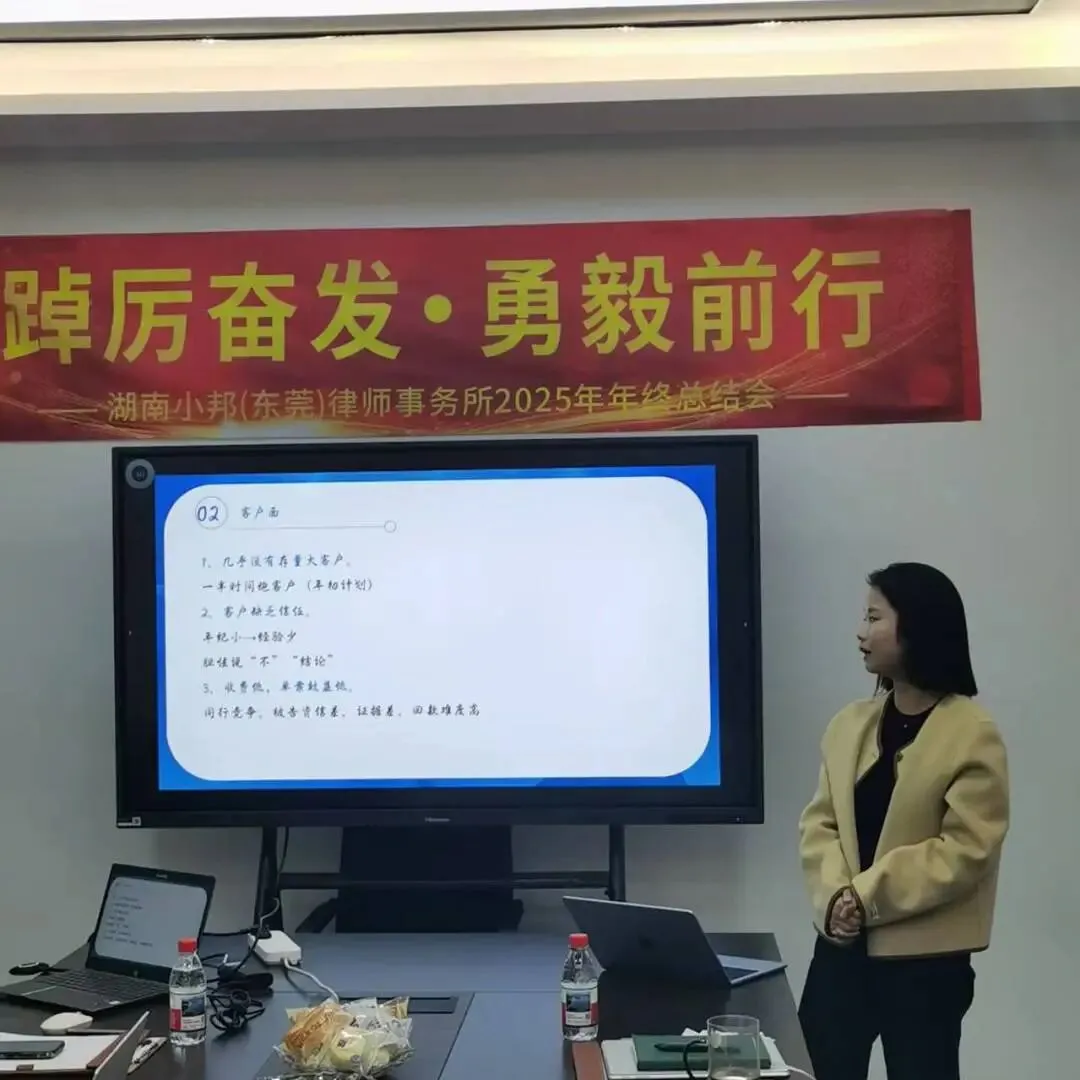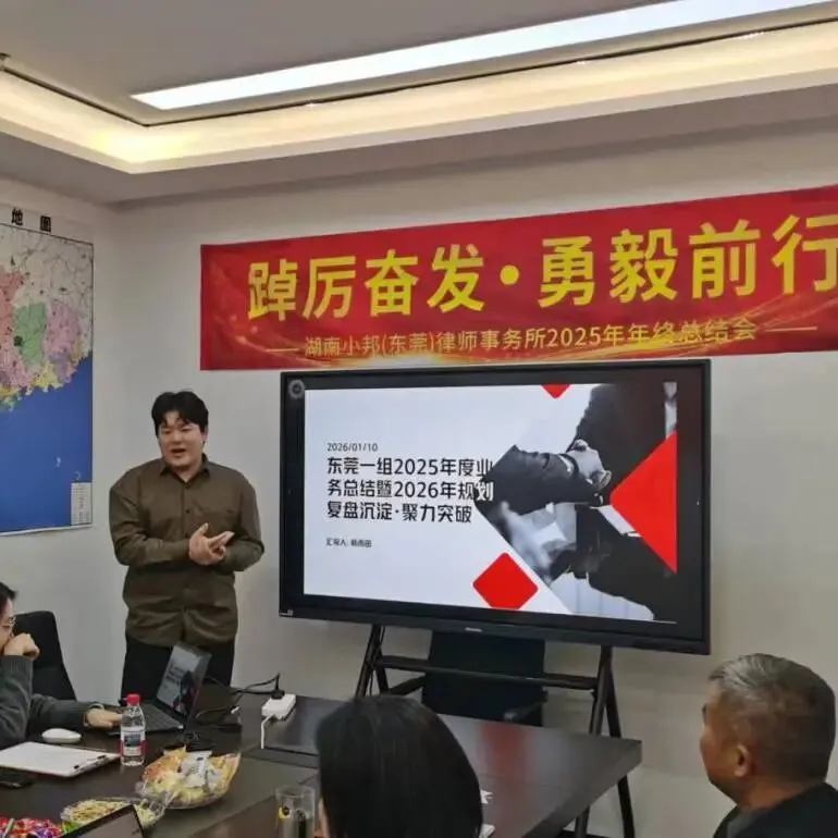 2026年1月21日,湖南小邦律师事务所东莞分所于律所会议厅举行2025年度年终总结暨展望大会。东莞分所全体员工齐聚一堂,共话过往、共谋发展。