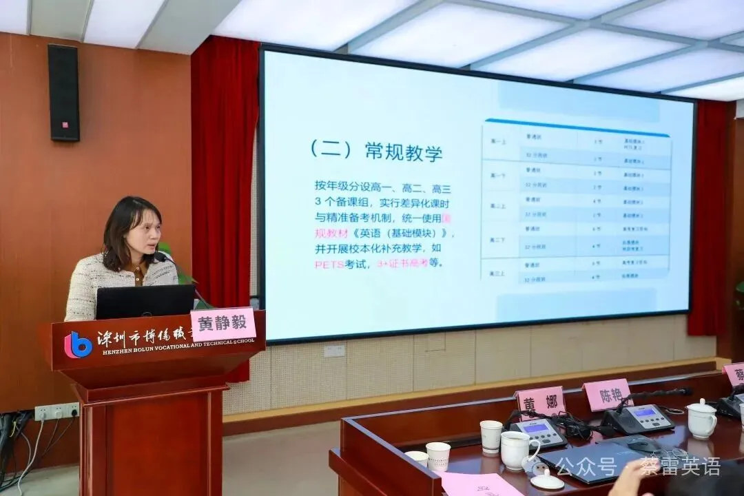 在科组建设经验交流环节,来自全市15所中职学校的英语科组负责人依次登台,分享各校在团队建设、教学改革、备考策略、AI赋能及学生活动等方面的实践与思考。