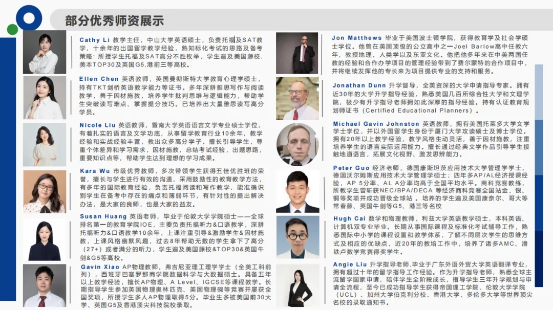 除此之外,美方合作院校的资深专家团队也是不可或缺的。费校教学督导每月定期驻校一周,监督指导教育教学,保证课程质量;费校金牌升学指导官,也会在学生就读期间到校为学生进行一对一的规划指导。