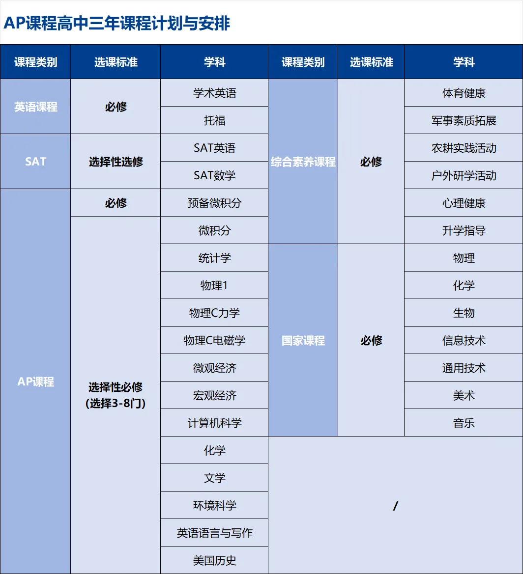 国际课程中心AP国际课程(授权代码694534)。AP课程提供十二种以上的必修选修的文理科目进行学习。在高中三年中除学习中国普高课程、语言课程外,中心将根据学生的个人情况帮助学生选择至少3到8门AP文理类科目进行学习,提升学生的综合实力以及提高申请国外大学的录取率。