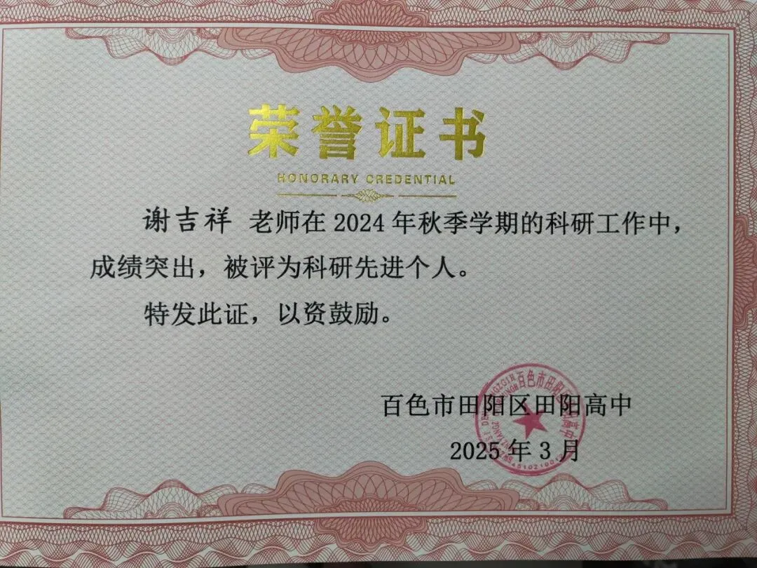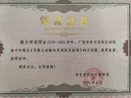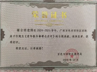 在田阳高中青年教师培养方面,谢吉祥老师扛起“传帮带”的重任,成为本校青年教师的“引路人”。他日常悉心辅导青年教师打磨教学技能,从教学目标设定到课堂互动设计逐一指导;在青年教师参与赛课时,他更是全程把关,从教学设计、课件制作到现场发挥等环节给出细致建议,助力青年教师快速提升教学能力,为田阳高中打造了一支更具战斗力的数学教师队伍。