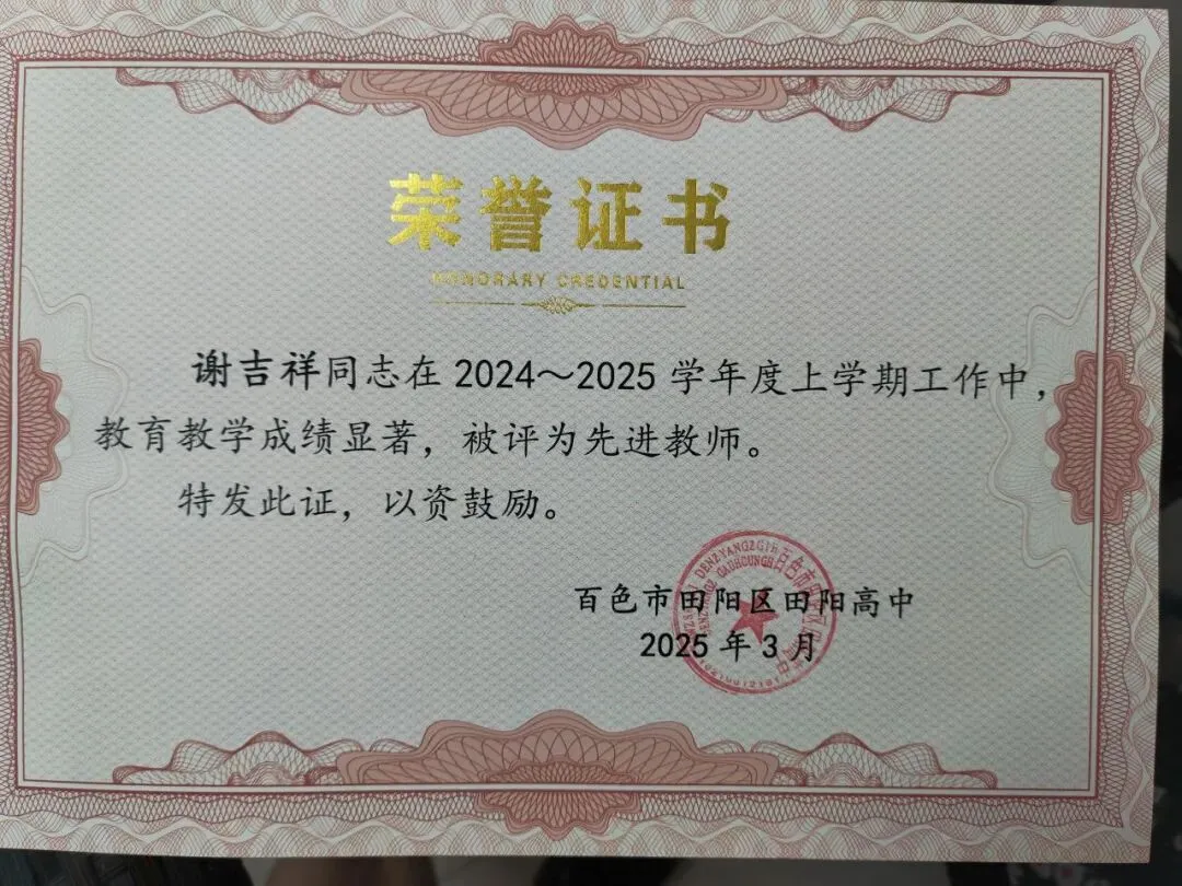 数本支教荣誉证书静静陈列,纸页间印刻着他在田阳的教学点滴:从课堂上的循循善诱,到教研时的倾囊相授,再到培育青年教师的悉心帮带,证书上的字字句句,不仅镌刻着谢老师跨越千里的教育坚守,更映照出一位资深教师以专业赋能田高教育的赤诚之心。