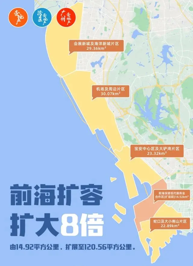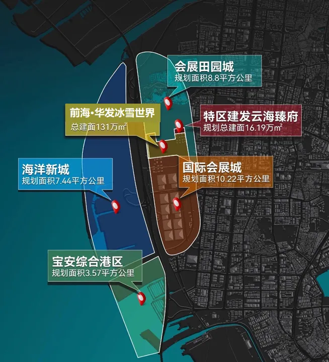 前海合作区扩大到约120.56平方公里,会展新城及海洋新城片区凭借双核规划优势,总投资超千亿元将直接撬动连通前海万亿规模经济带,将成为粤港澳大湾区新的经济增长极。