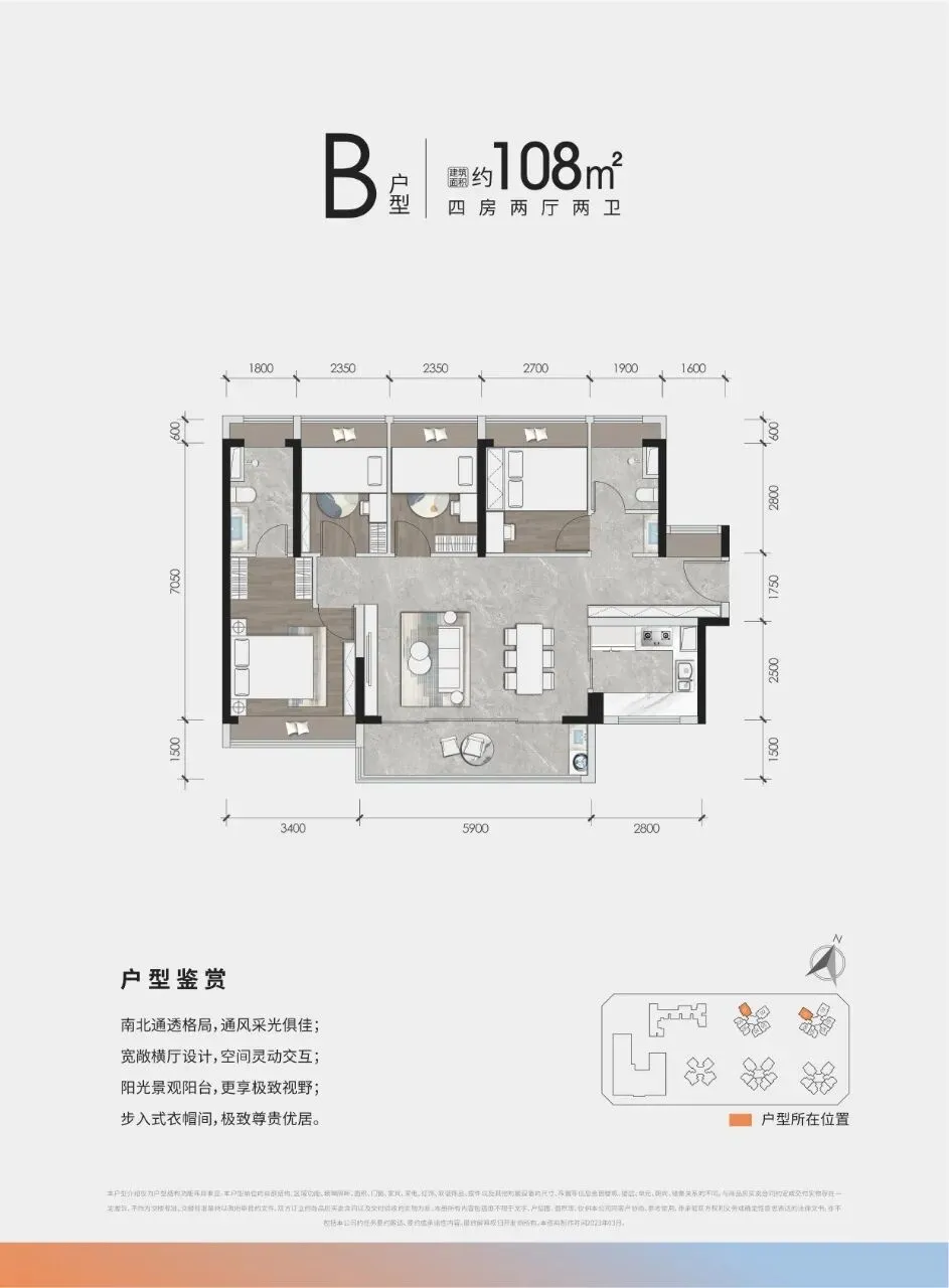 108㎡ 4房2厅2卫:稀缺南北通透4房,约5.9米阔绰阳台,三分离卫生间