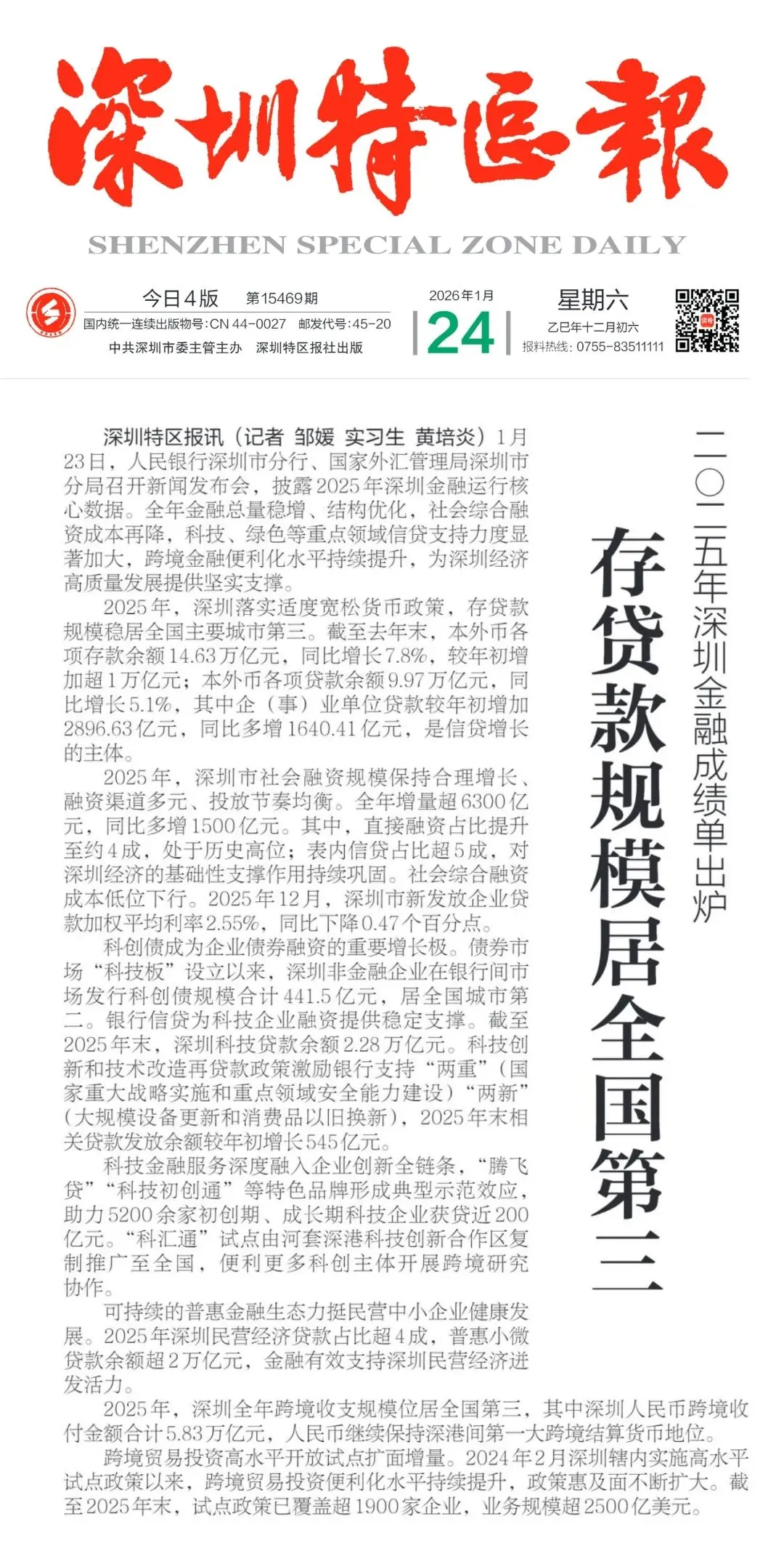 23日,人民银行深圳市分行、国家外汇管理局深圳市分局联合举行2025年深圳金融运行情况新闻发布会。据悉,2025年,深圳金融业保持了稳中有进、结构持续优化的整体态势,金融总量实现合理平稳增长,存贷款规模稳居全国主要城市第三,适度宽松货币政策落地见效,为经济高质量发展提供坚实金融支撑。
