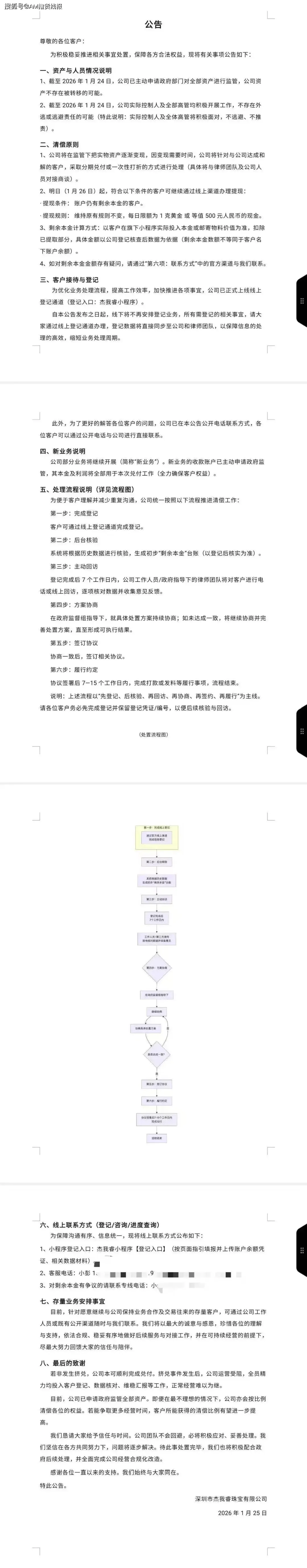这两天,深圳,一家名叫“杰我睿”的商户又在网络平台火了起来。那为什么火呢?事情源于通过该公司小程序购买的黄金,或者出售的黄金,不能进行兑换或者提现,引发受害人维权。后面该公司发布公告称,因为遇到“挤兑”,公司现在没法正常兑付了。为了应对,他们给出了一个让很多人愣住的方案:每天,每个客户最多只能取500块现金,或者提1克黄金。500块,听起来像个给大家开的玩笑。有客户粗略算了算,如果真按这个速度,想把钱全拿出来,得等上好几年。