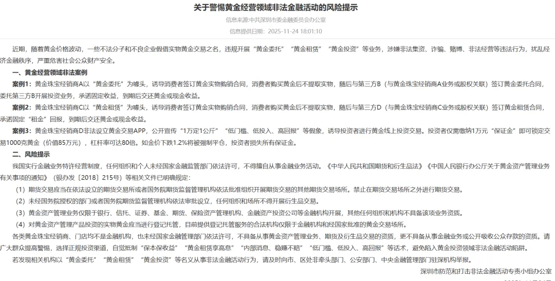 就在去年11月,深圳市专门打击非法金融的办公室就发过明确公告,直接点出一些黄金珠宝店打着“黄金托管”、“租赁返利”的旗号,实际上在干非法集资的活。公告里说得特别清楚:所有的金店、珠宝商,都不是银行或证券公司,国家根本没批准过它们去做黄金理财、炒期货这些金融业务。合法的黄金投资,老老实实找银行、上海黄金交易所这些持牌机构才是正路。最近金价银价波动得厉害,好几家银行也接连发文,提醒大家注意市场风险,有的甚至还提高了投资门槛。这些信号都在说明,外面的水很深。