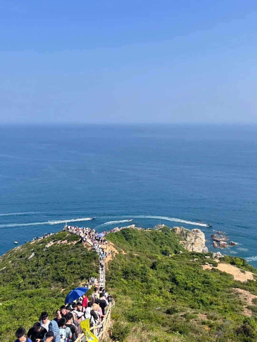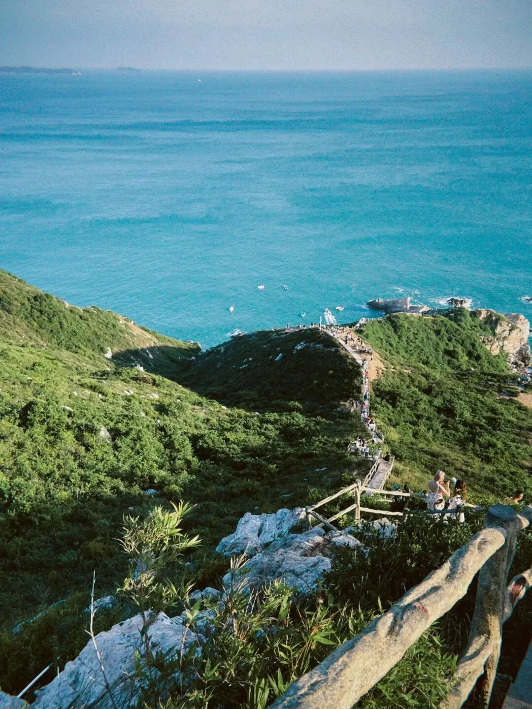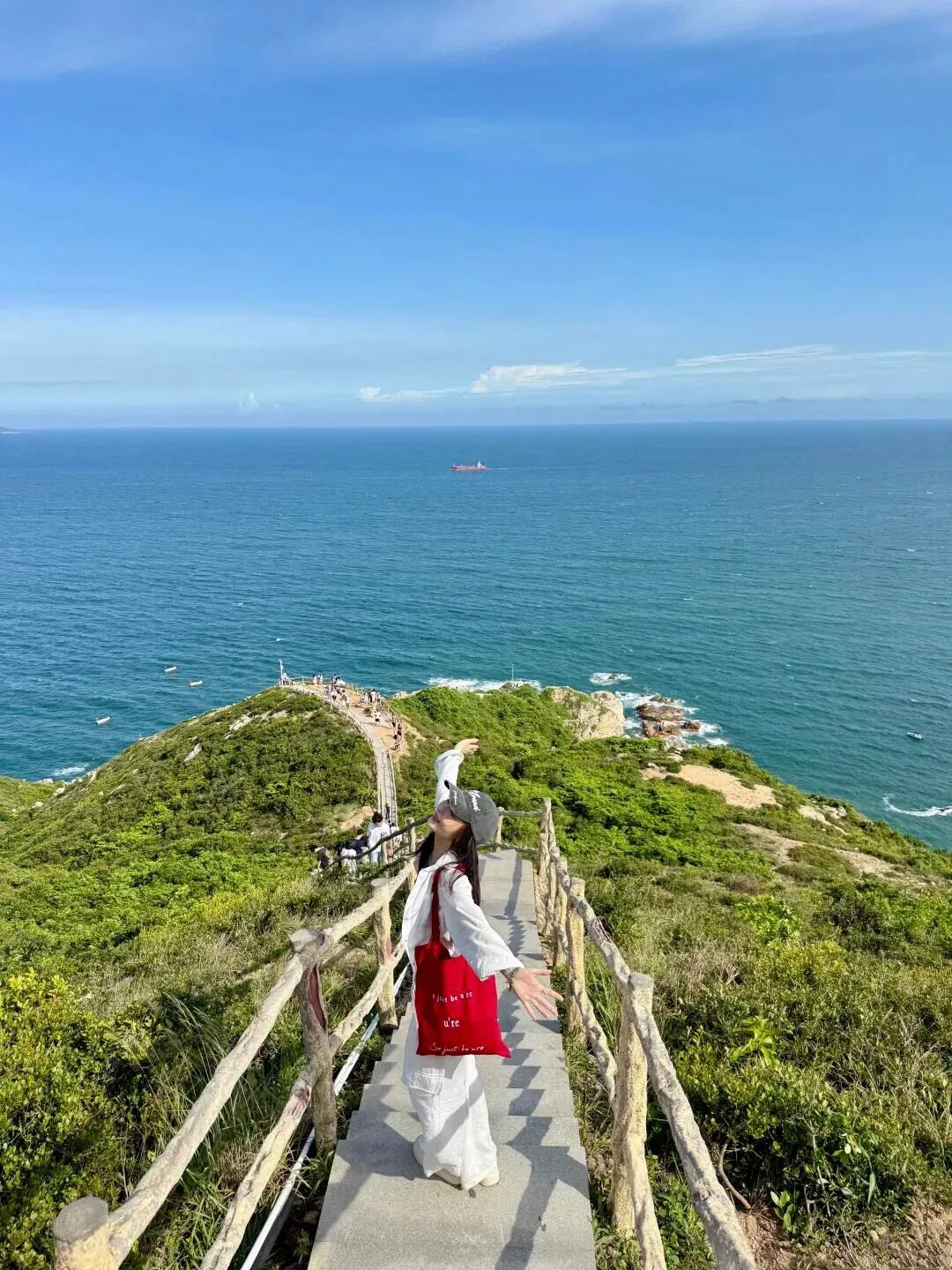 天文台栈道嵌在悬崖边,脚下是澄澈的蓝海,身旁是摇曳的野枝,阳光穿过云层洒在身上,此刻连呼吸都与山海同频。