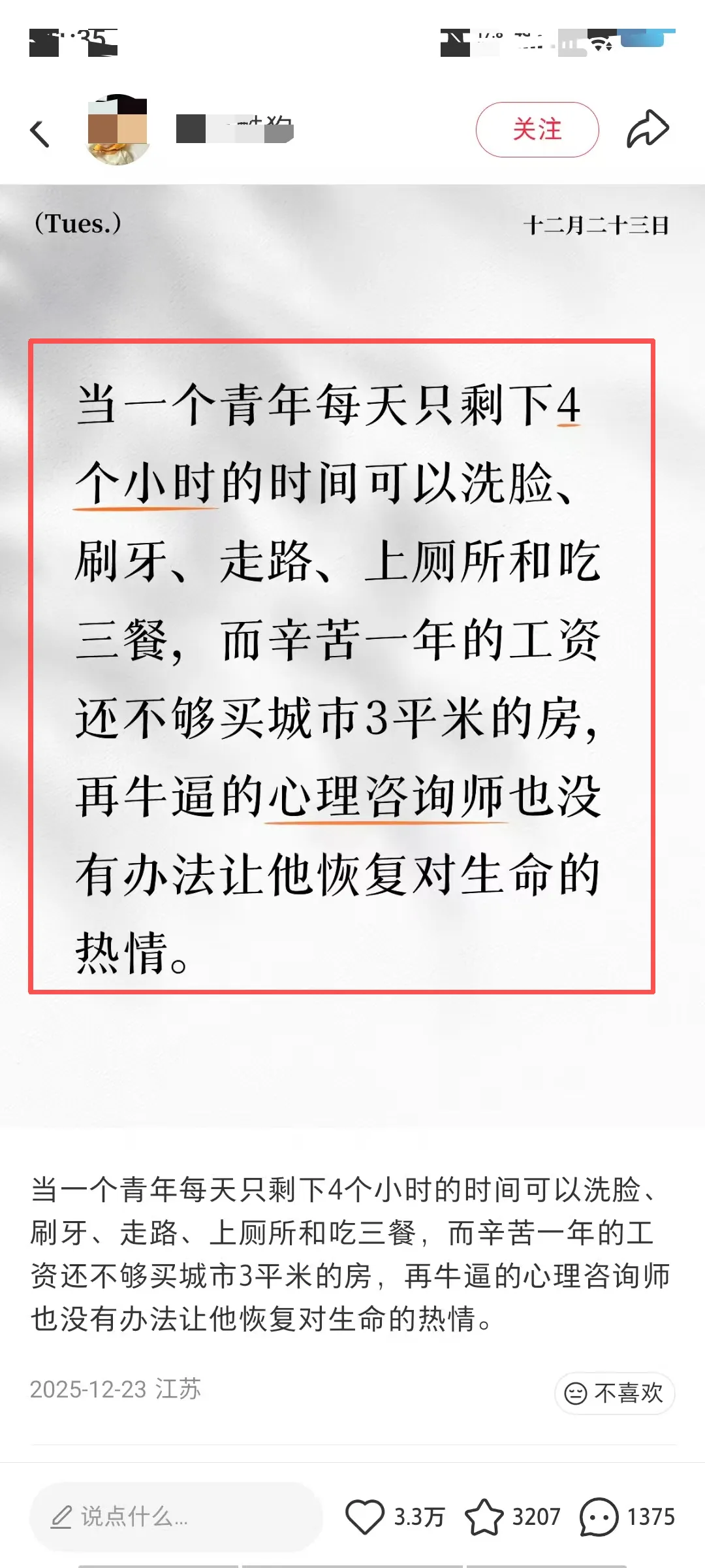 当一个青年每天只剩下4个小时的时间可以洗脸、刷牙、走路、上厕所和吃三餐,而辛苦一年的工资还不够买城市3平米的房,再牛逼的心理咨询师也没有办法让他恢复对生命的热情!