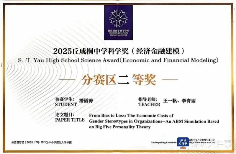 目前就读于建文外国语学校高三(12)班的潘语涛同学,在素有“华人青少年诺贝尔奖”之称的2025年丘成桐中学科学奖中,凭借经济金融建模赛道的课题研究《从偏见到损失:组织中性别刻板印象的经济成本——基于ABM和大五人格理论的仿真研究》,从全球2800余支参赛队伍中脱颖而出,斩获二等奖。