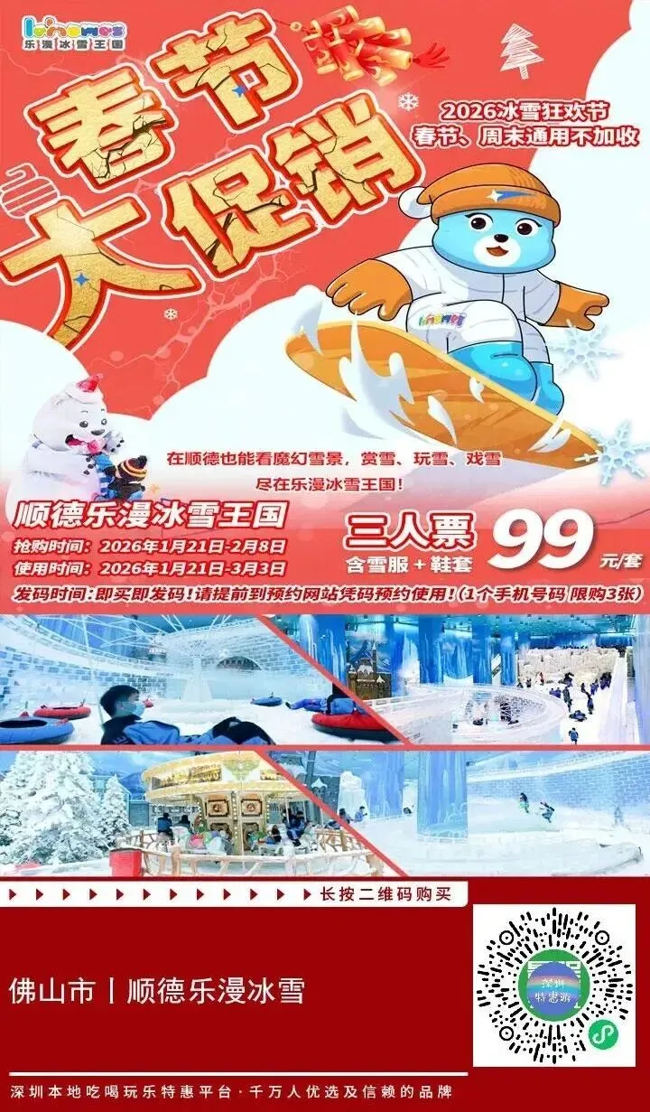 2026年冰雪狂欢节,顺德版“尔滨”冰雪王国放价啦!春节不加收!乐漫·冰雪王国限时限量秒杀!99元特惠抢“三人票”大型真冰雪体验!玩转顺德3000㎡冰雪王国!看魔幻雪景,赏雪、玩雪、戏雪,更有[“马”上来玩雪]春节特别活动!记得提前预约哦~