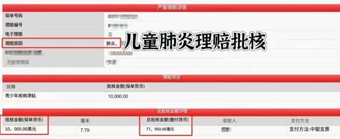 客户2024年12月给孩子买了重疾险,基本保额20万美元。今年4月,孩子在和睦家看急诊,诊断支气管炎,医生说比较严重,需要住院。客户一时心乱,在申请时也说不清楚情况。于是代理直接和医生通话沟通:“1. 住院至少要3天;2. 确认支气管炎是肺炎的一种,请在理赔申请书上按肺炎写。” 5月份,代理和理赔部多次沟通,顺利批核赔付10000美元,约7.2万人民币。