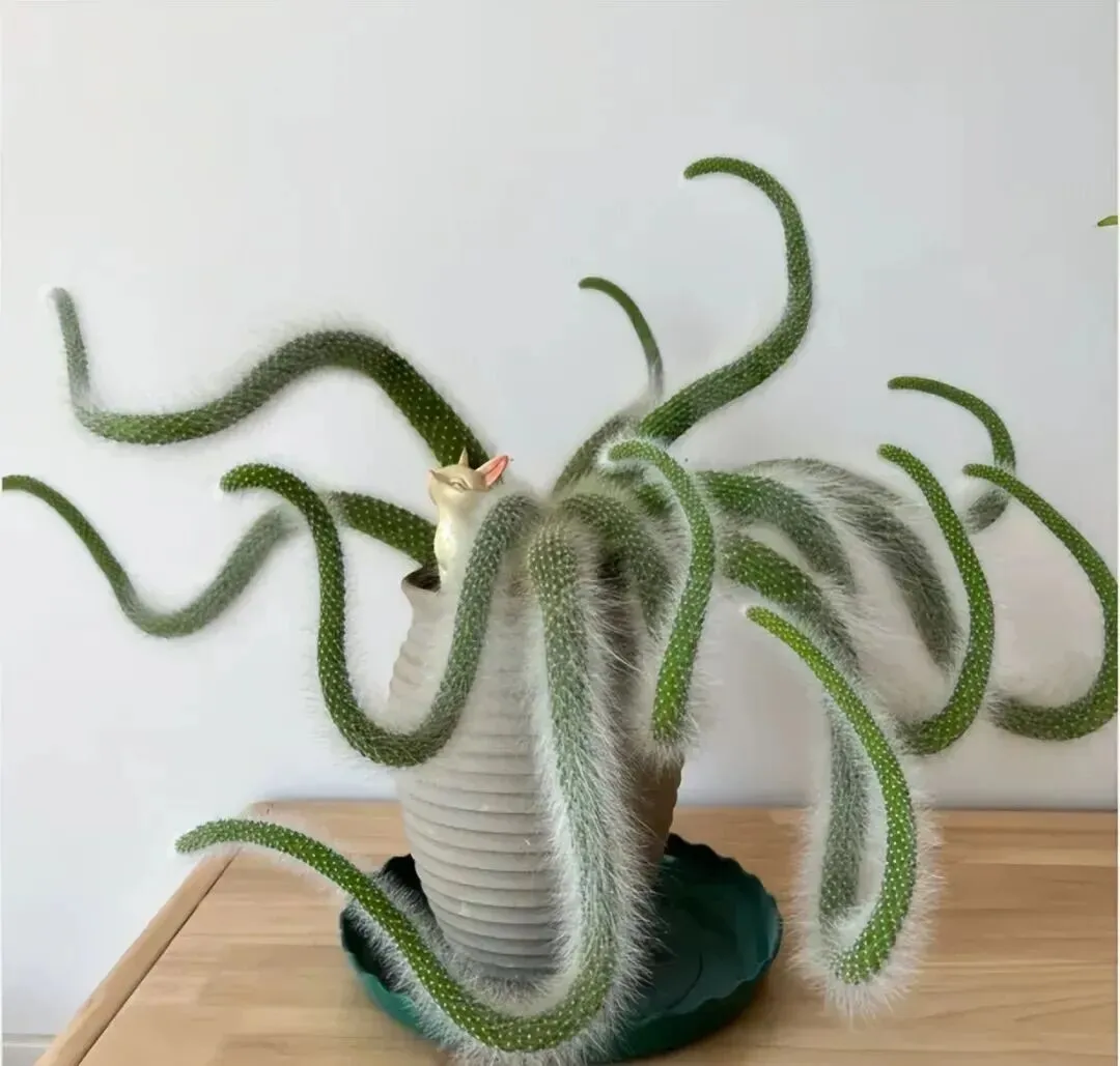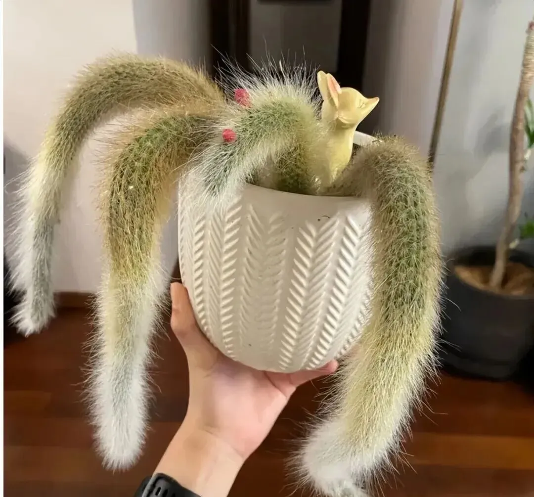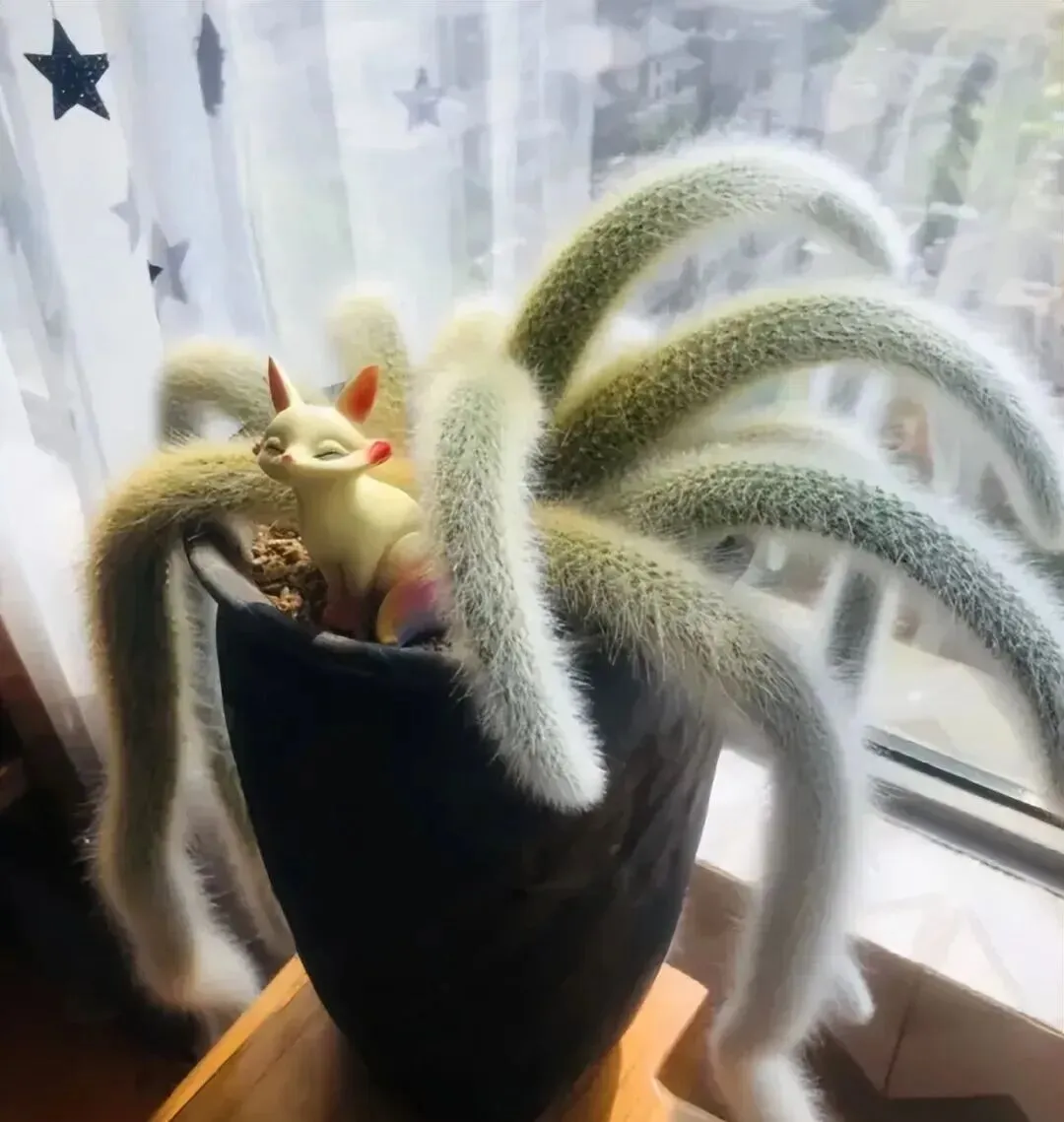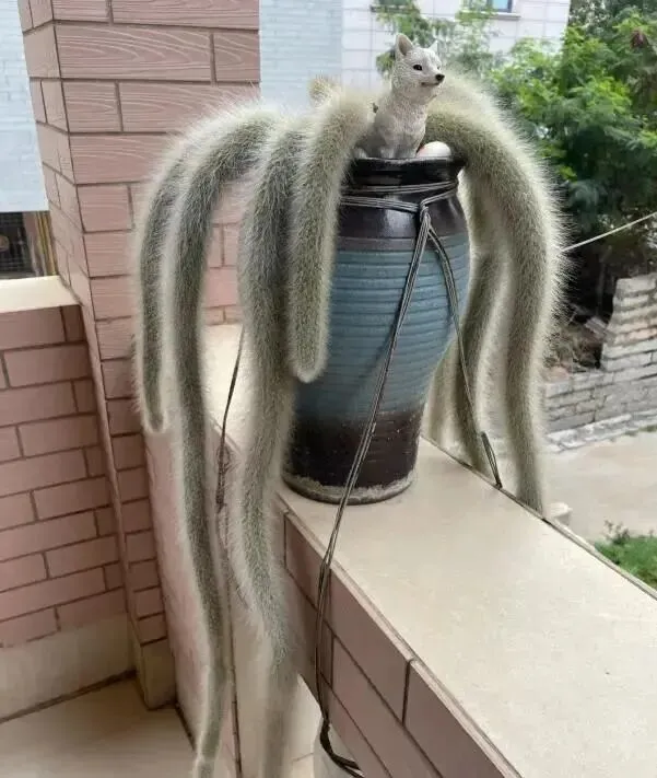 它的茎很软 , 不像普通仙人掌那么硬邦邦 , 外面覆着一层长长的白色软毛 , 摸起来是柔的 , 尾尖细细的 , 远看真的像动物尾巴。