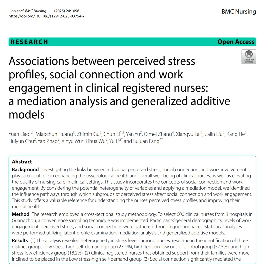 2025年8月在SCI杂志《BMC Nursing》上发表了题为《Associations between perceived stress profiles, social connection and work engagement in clinical registered nurses: a mediation analysis and generalized additive models》的文章。本研究探讨了临床护士的感知压力、社会联系和工作参与之间的关系,强调了提升护士心理健康和护理质量的重要性。通过对广州市三家医院600名护士的横断面调查,结果揭示了护士压力水平的异质性,形成了三个组别:低压力-高自我要求组、高紧张-低失控组和高压力-低效率组。家庭支持的护士更有可能属于低压力组,而社会联系在护士的工作参与与感知压力之间起到重要的调解作用。研究呼吁护理领导关注护士的压力模式,实施有效的管理策略,以增强心理健康和职业幸福感,从而降低离职率并提高护理质量。