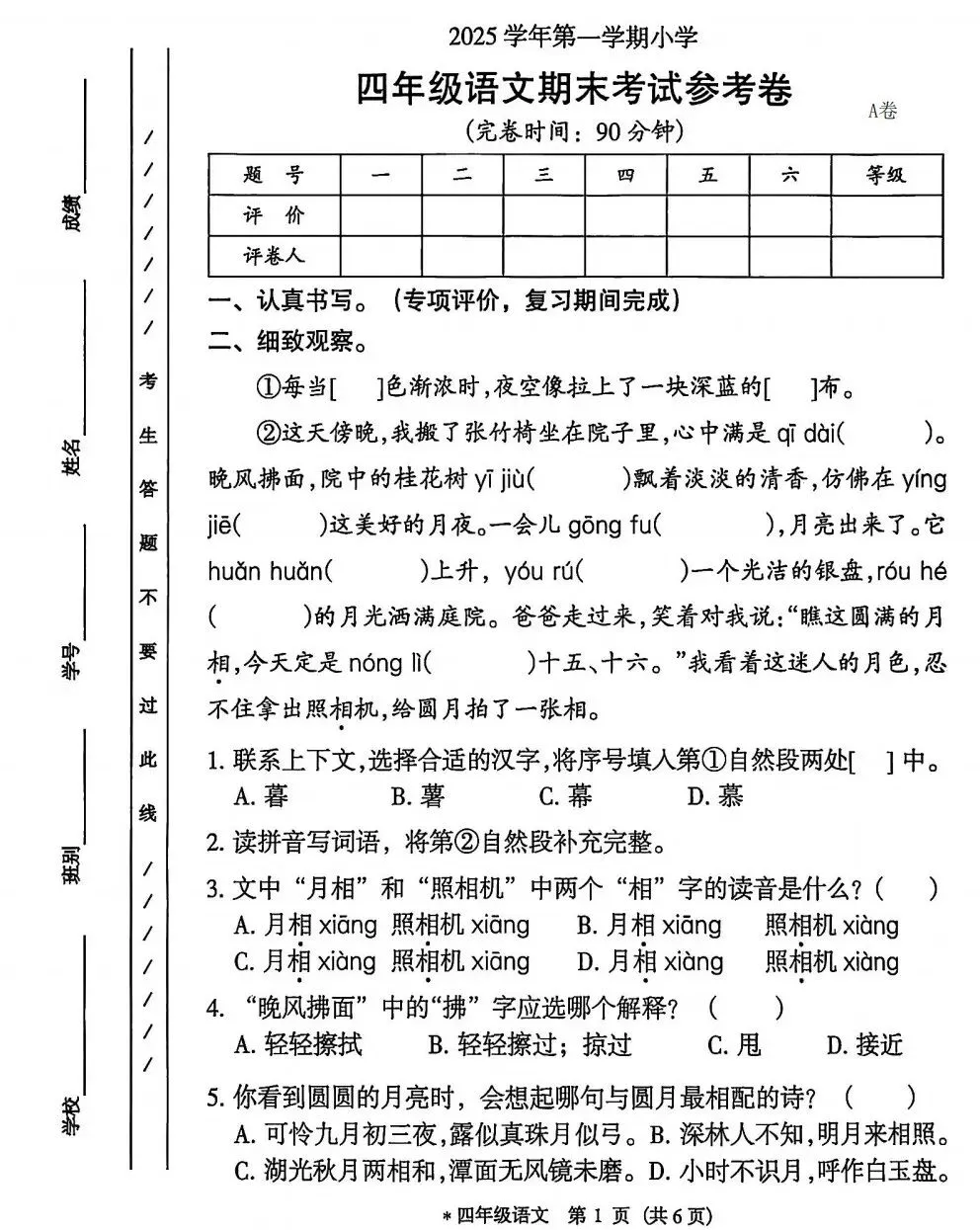 广州市海珠区2025-2026学年上学期四年级期末考试语文试题和答案A