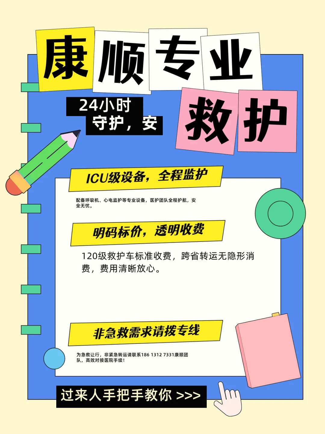 咨询或预约请拨186 1312 7331(微信同号),专业提供非急救医疗转运服务,24小时待命,安全护送每一位患者。