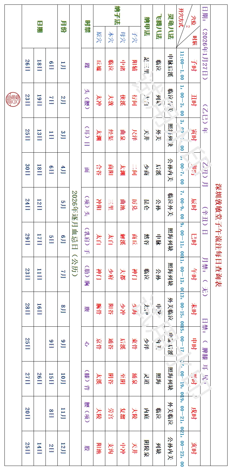 >深圳敦敏堂《子午流注:今日开穴》 2026 1月27日
