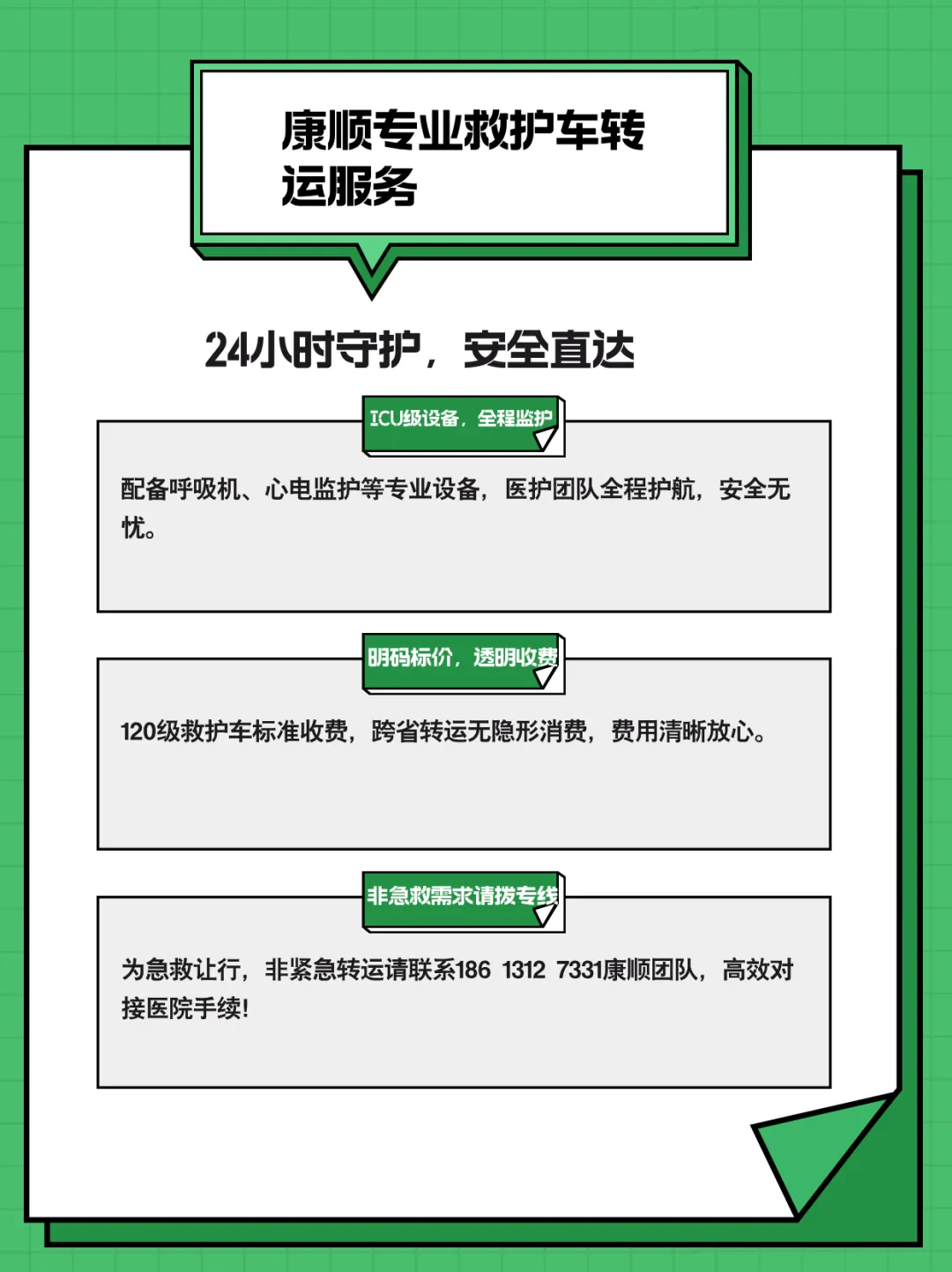 咨询或预约请拨186 1312 7331(微信同号),专业提供非急救医疗转运服务,24小时待命,安全护送每一位患者。