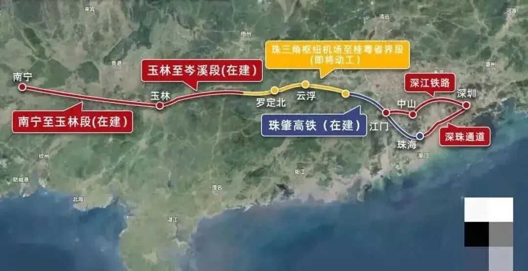 🚝深江铁路(116公里):深圳西丽至南沙段设计速度200公里/小时、南沙至江门段设计速度250公里/小时,设西丽、深圳机场东、东莞滨海湾、南沙、中山北、横栏、江门7座车站。