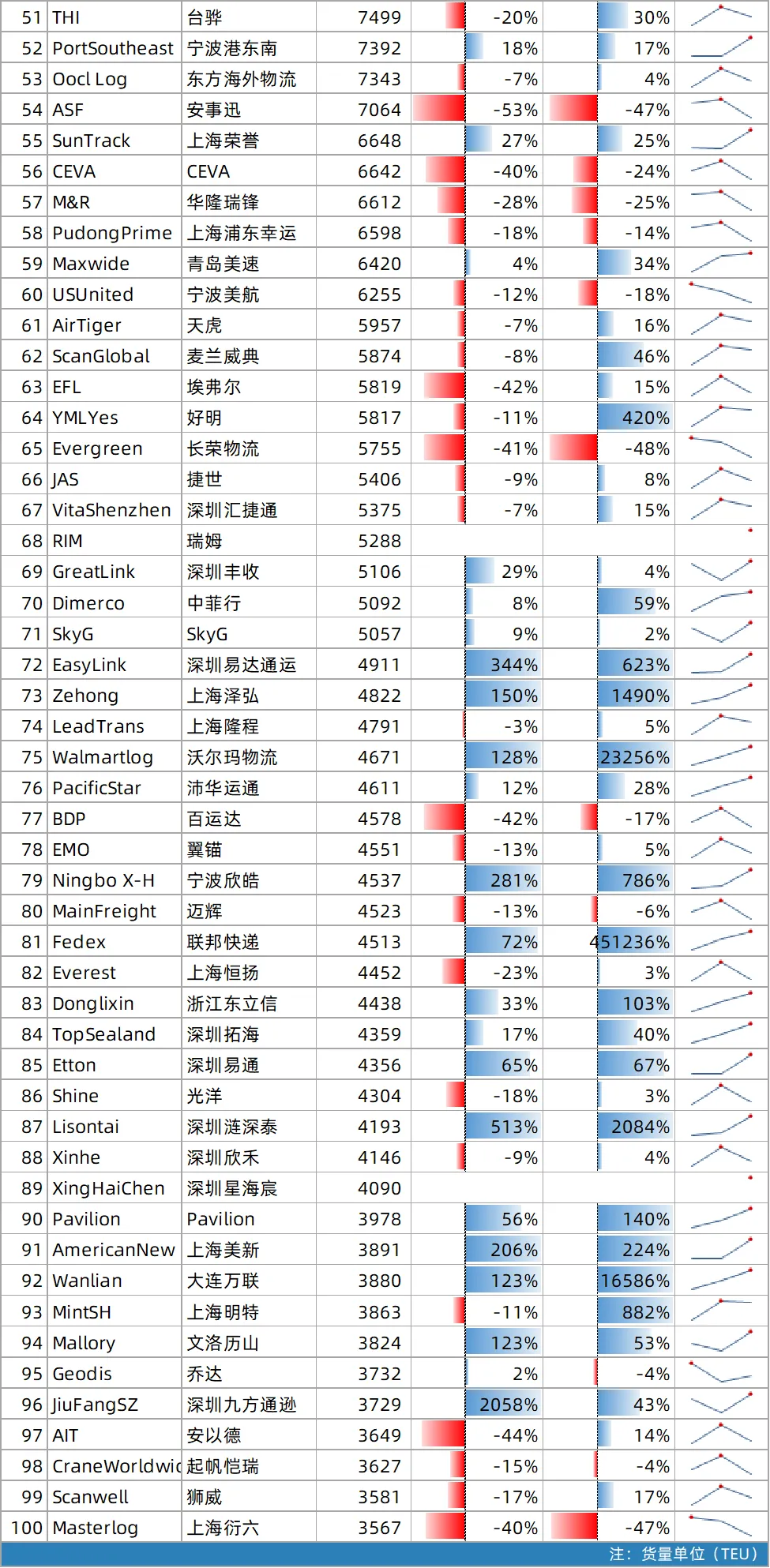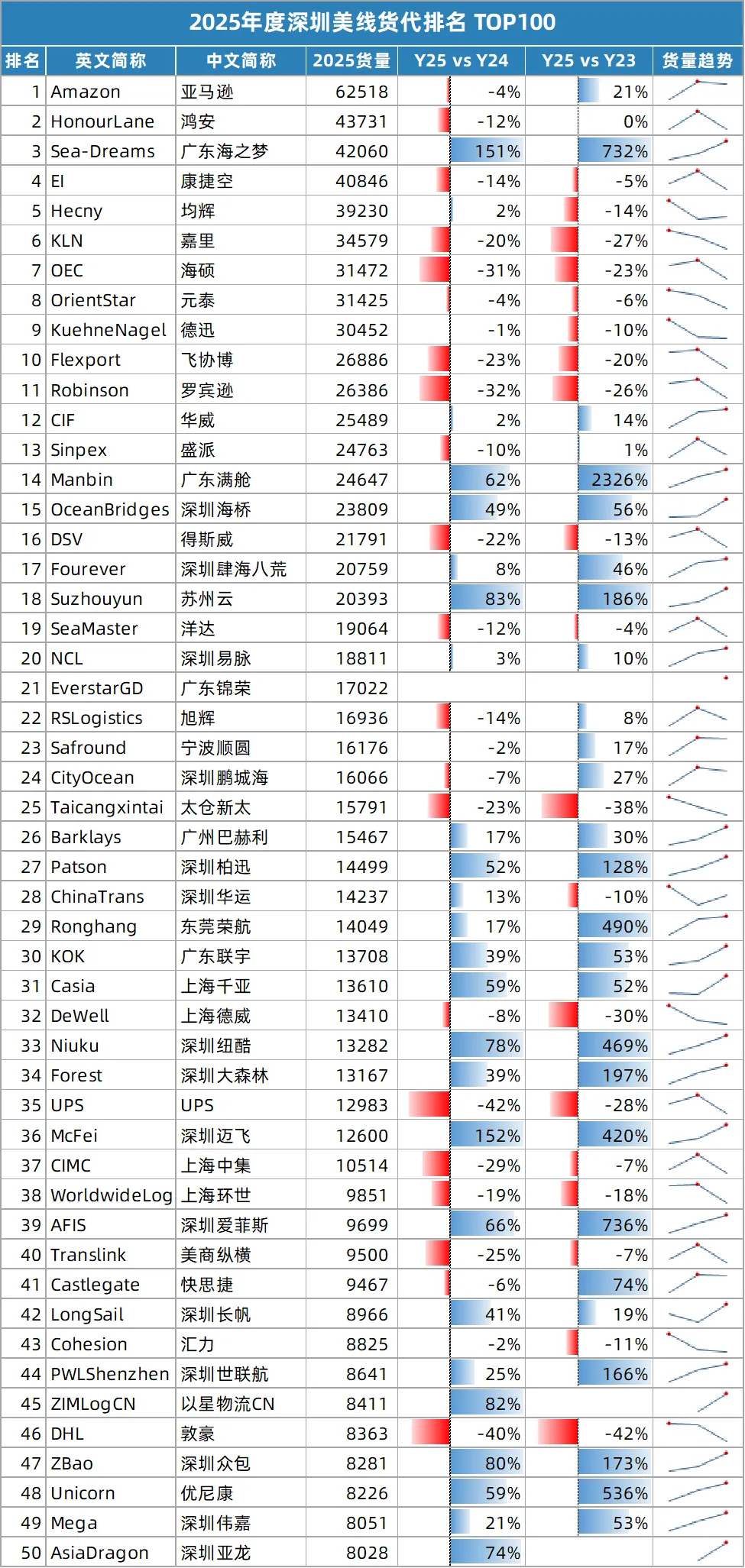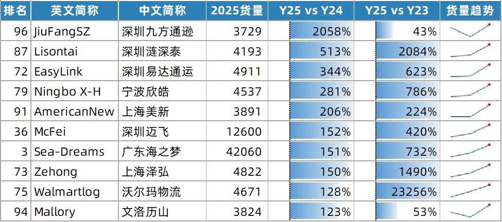 同24年相比,25年增长超100%的货代共计10家,总部以深圳和广东为主。