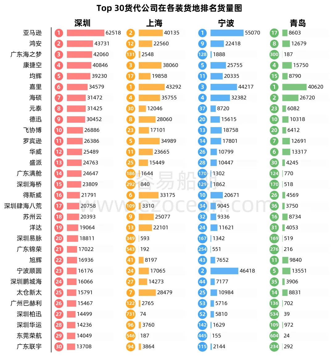 🔹 三年维度看,前50名中的广东海之梦、广东满舱、东莞荣航、深圳纽酷、深圳迈飞、深圳爱菲斯等本土企业成为两年最大黑马,三年增幅普遍在400%以上,华南货代在跨境电商链路上强势崛起
