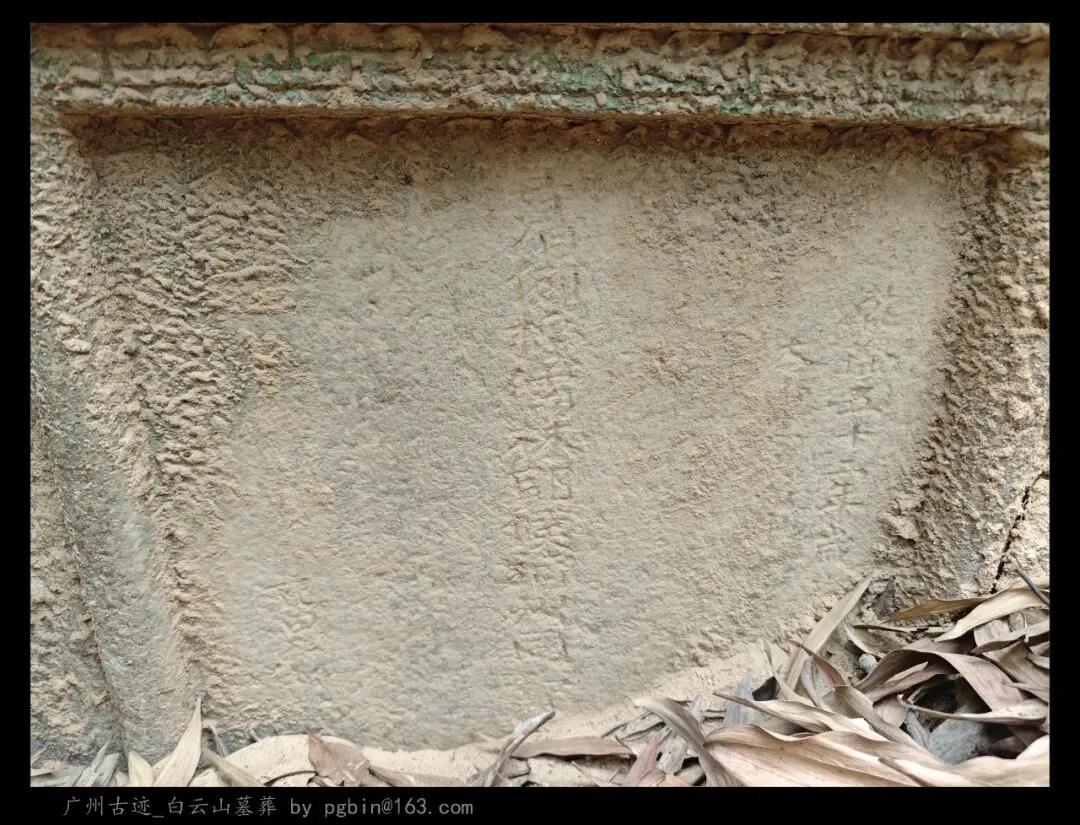 墓葬四周未发现山界,环垄正中立有白云山上极其罕见四柱三间庑殿式式墓碑,墓碑框与墓碑一体雕刻,下半部以四根纤细圆柱构成四柱三间布局,两侧窄中间宽,中间刻“皇清例授儒林郎候选知同知記……”,上款“乾隆五十二年歲次……”,下款“祀男……”。墓碑顶部是仿庑殿造型,殿前两侧石狮、殿内四柱三间布局,以及顶部鳌鱼戏火焰宝珠的纹饰均清晰可见。墓额是祥云涌月纹饰,墓后一级护岭。