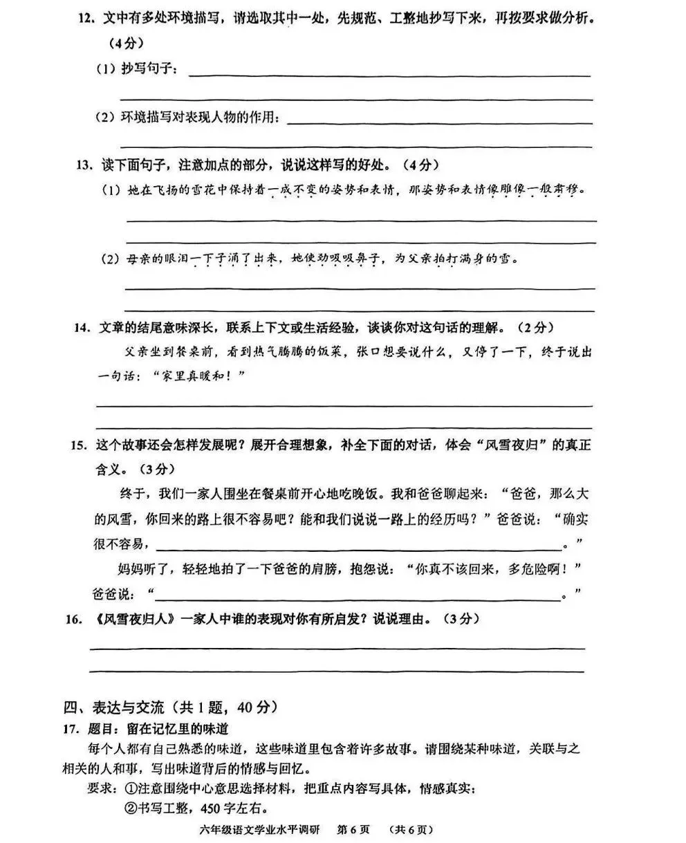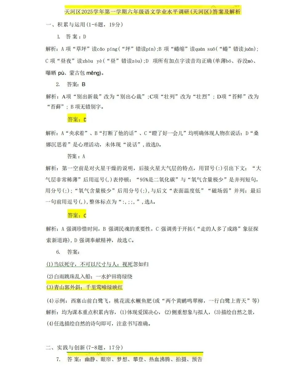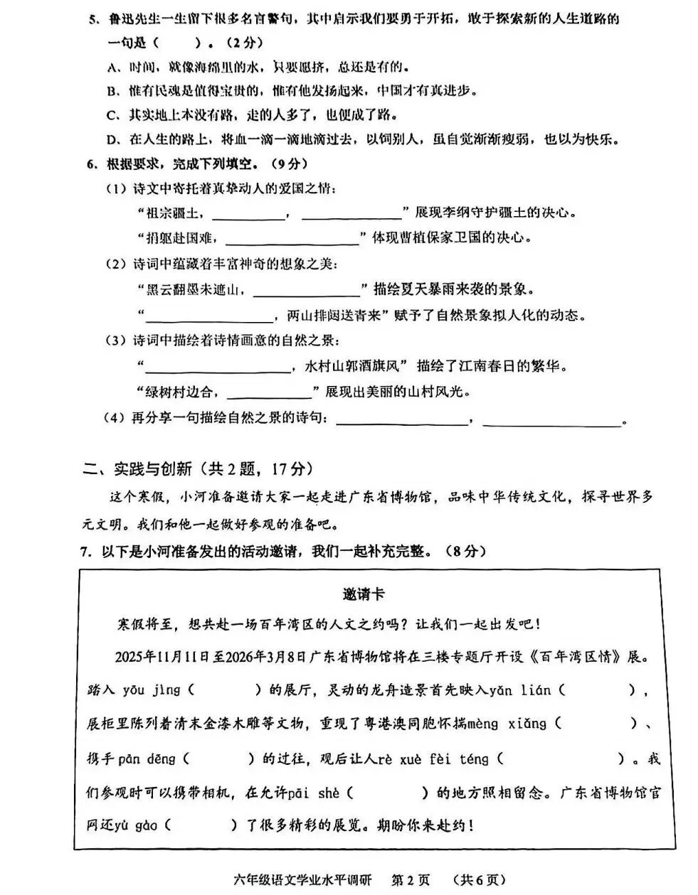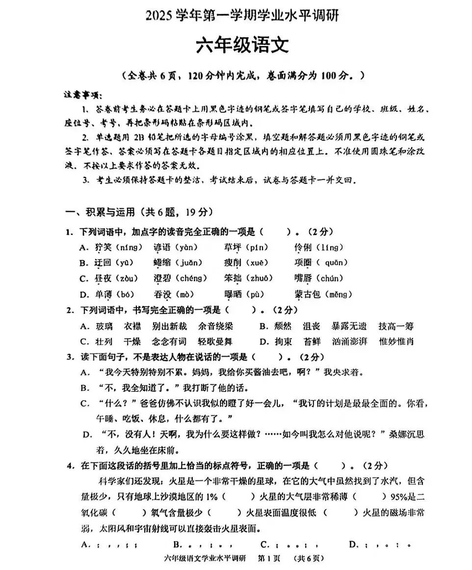 广州市天河区2025-2026学年上学期六年级期末考试语文试题和答案