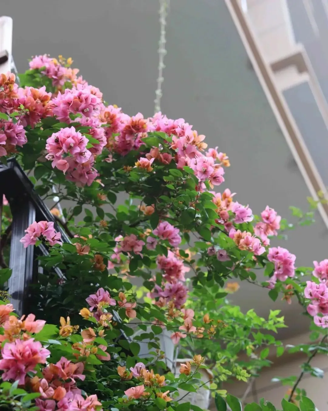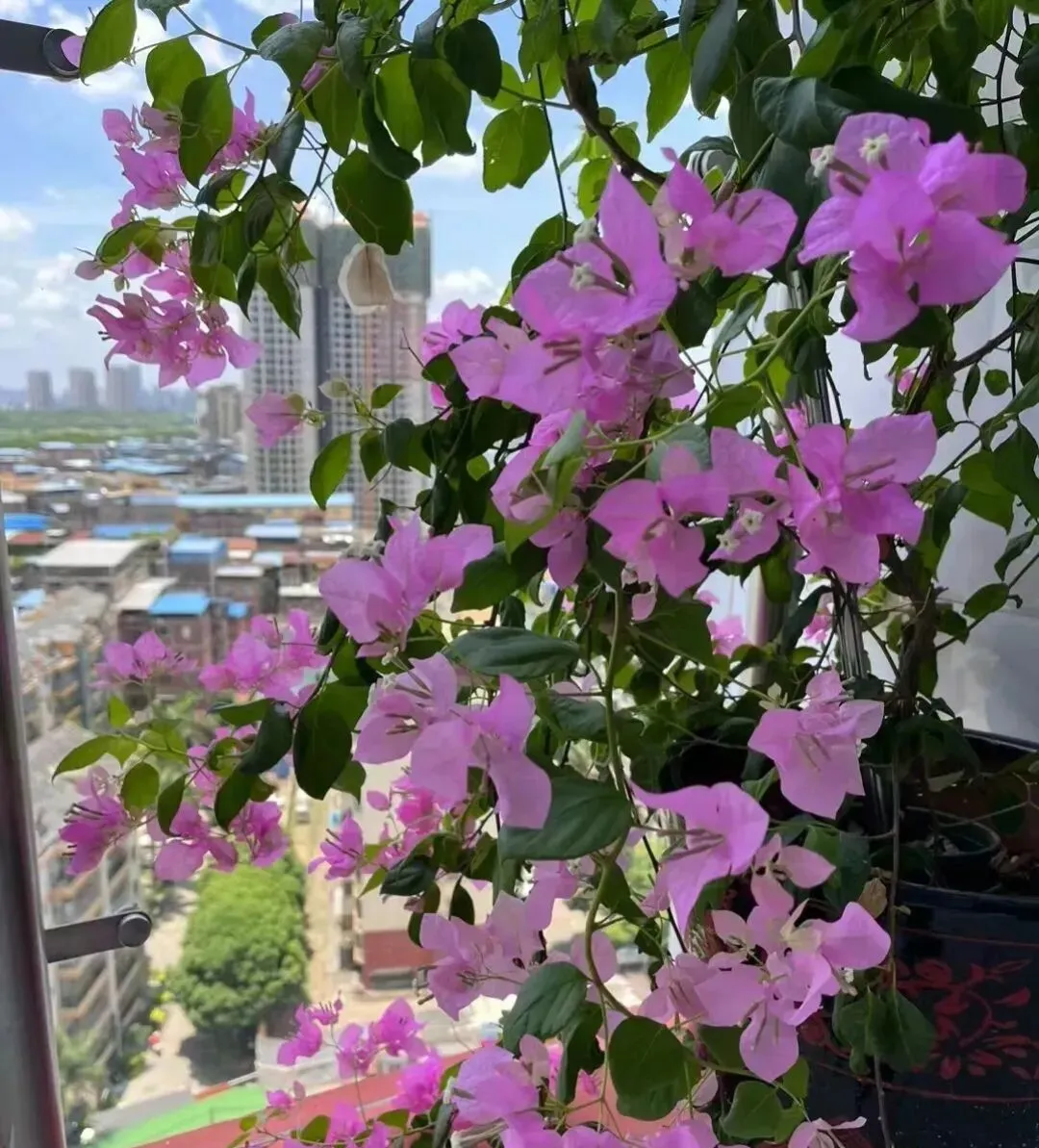 南方的开放式阳台,尤其是朝南的,真的是天然“花房”。三角梅这种喜欢阳光的植物,光照越足,叶子就越少,花反而越多。很多人问我,为什么别人家三角梅能开成花瀑布,自己家的总是叶子多、花稀少?其实光照和通风是最大关键。像广州这位花友的阳台,一年四季都有足够的直射阳光,三角梅才能不停抽枝、开花。