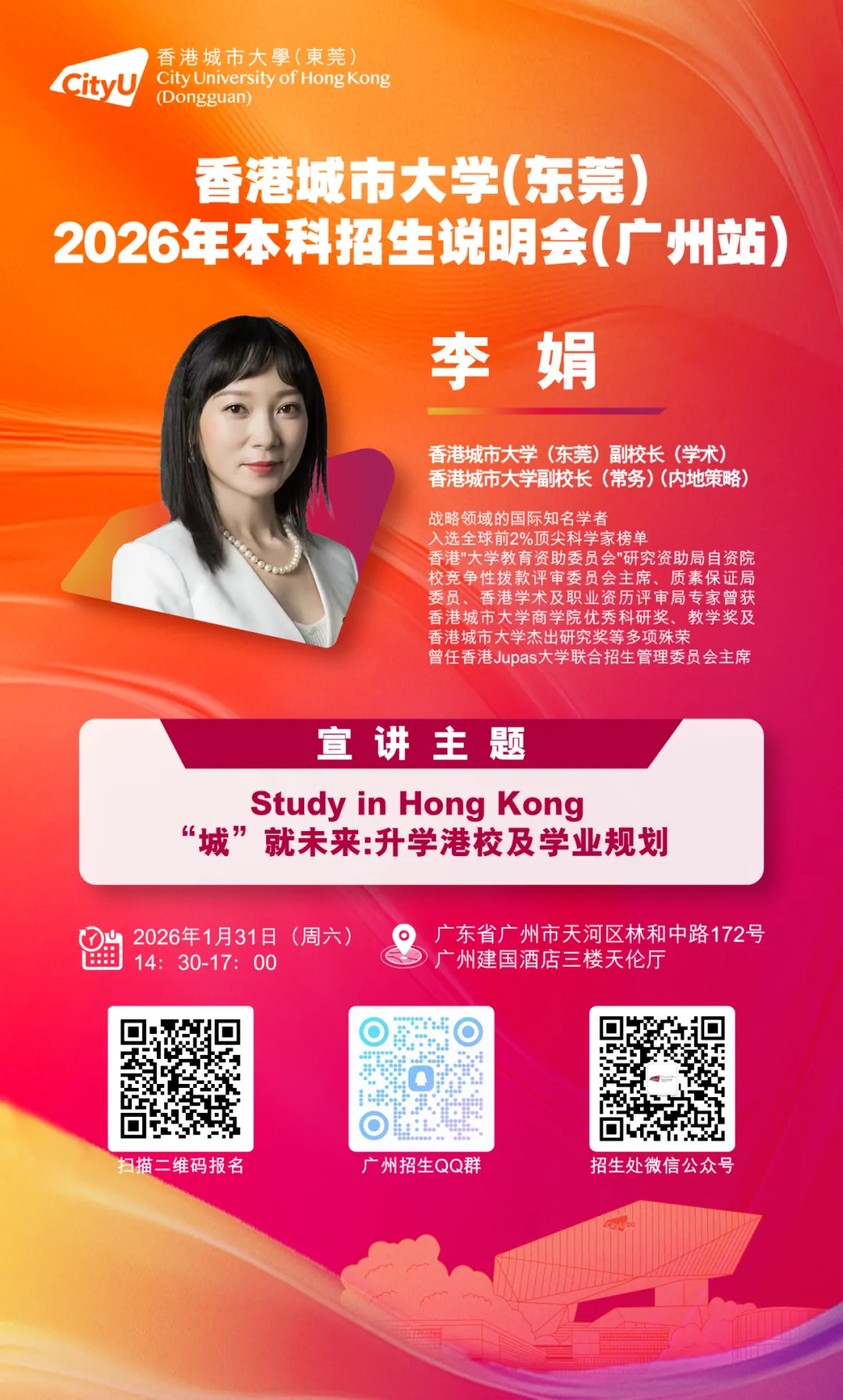 香港城市大学(东莞)将于2026年1月31日在广州举行本科招生说明会,与广大家长和考生面对面交流,答疑解惑。欢迎参加!